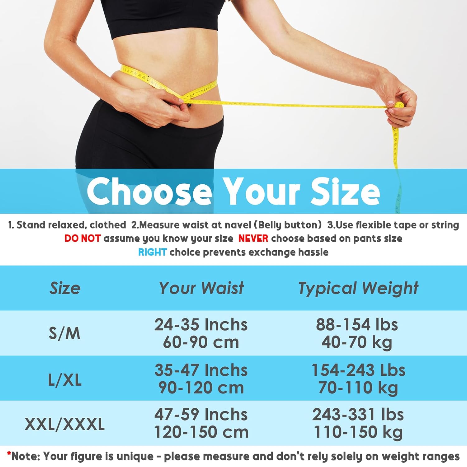 5. **Easy Sizing for Perfect Fit**: To ensure you get the best fit, measure your waistline one inch above your belly button and compare it with our size chart. Achieve optimal support and comfort tailored just for you.