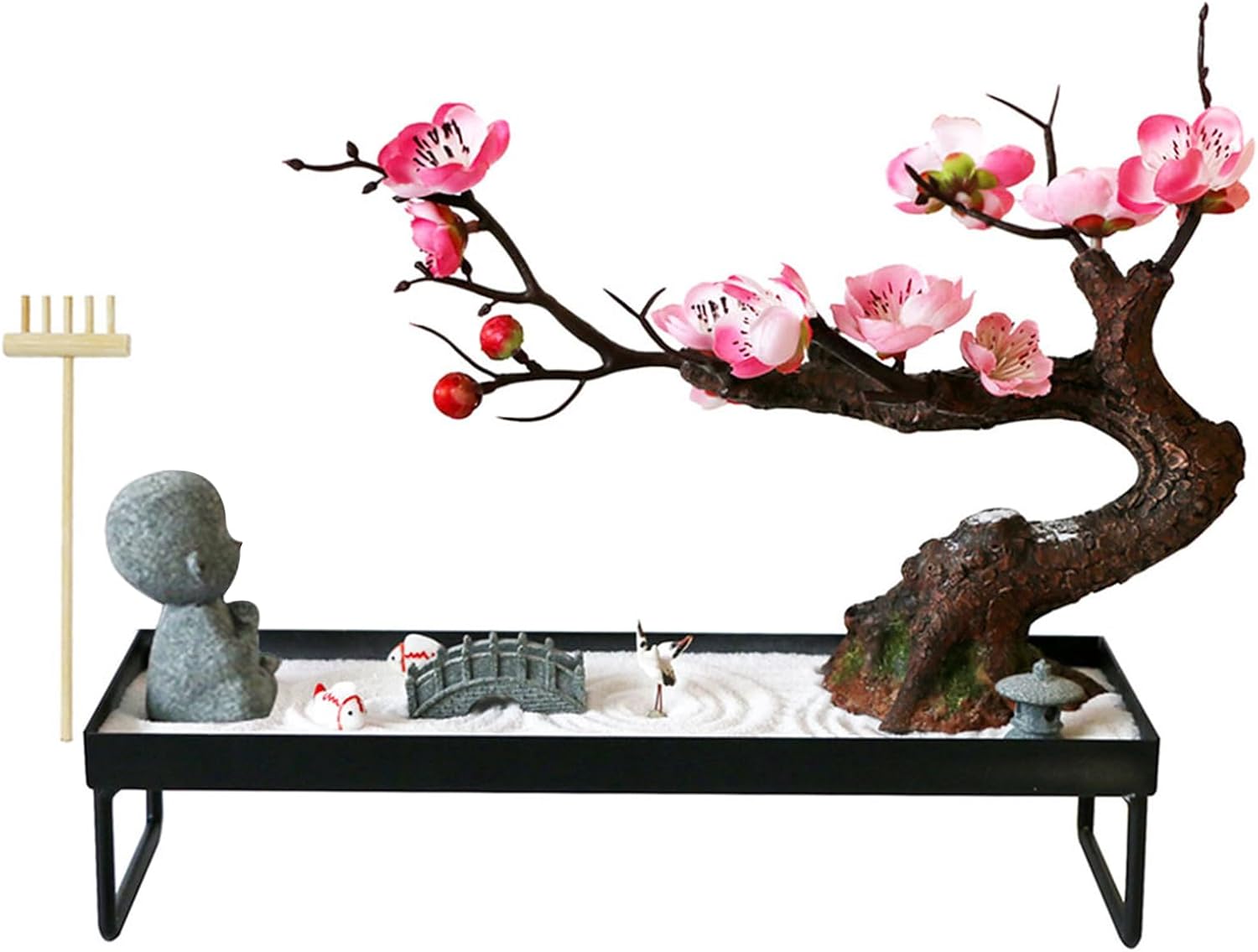 Mini Zen Garden Kit for Desk – Beautiful Plum Blossom Zen Sand Rock Garden, Home Office Desktop Zen Decor Japanese Gifts for Women Lady Friends,Iron Crafted Meditation Therapy Tray Natural Rake