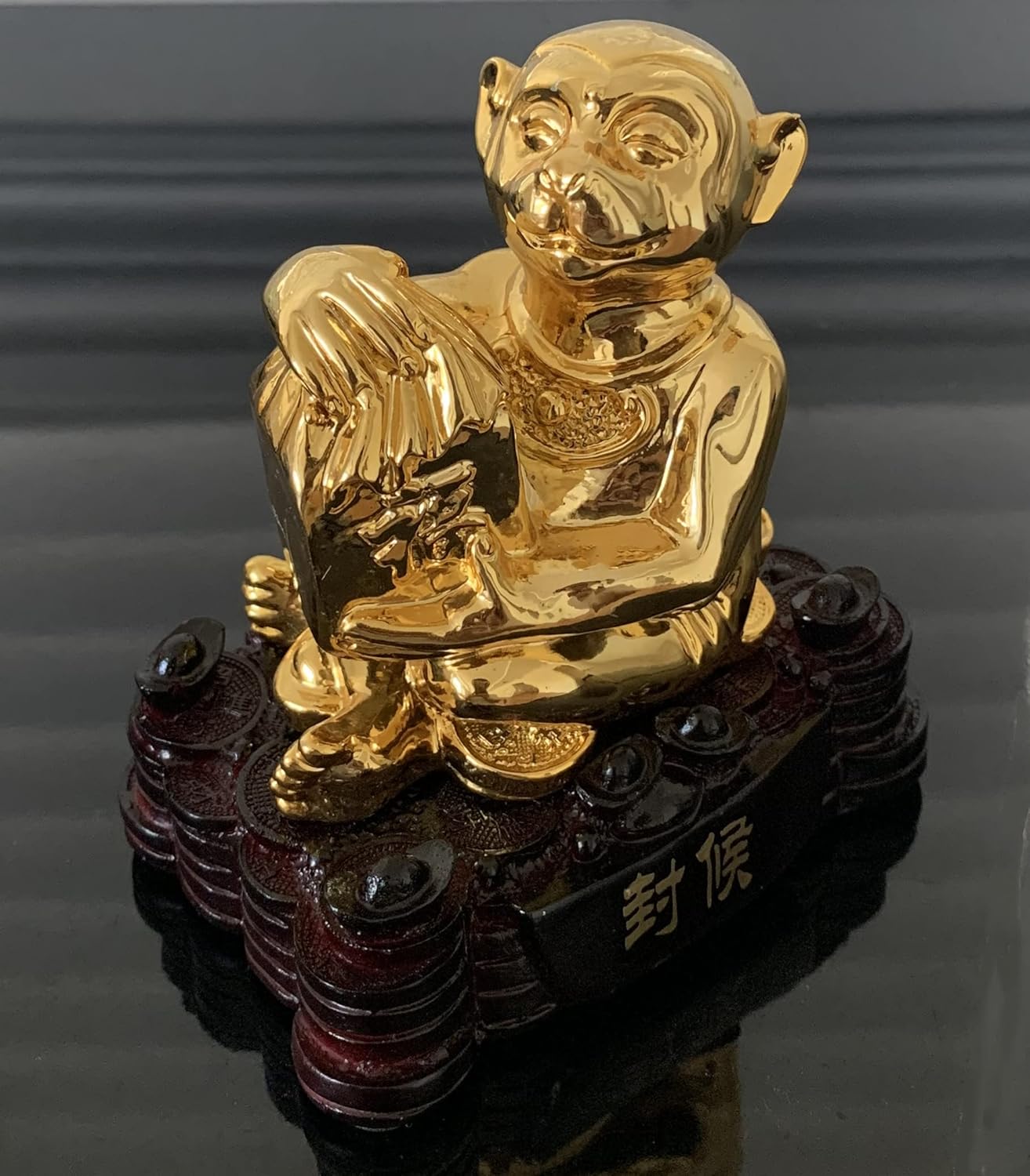 Our sale is for one gold color monkey holding a fortune box and sitting on the treasure base for good luck. Size: 3.75″L X 2.5″W X 5″H. Made of resin.