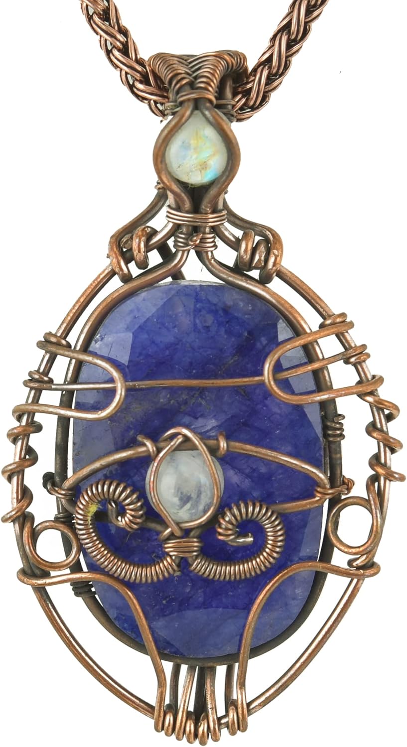 Evil Eye Blue Sapphire & Moonstone Gemstone Pendant Copper Wire Wrapped Jewelry Necklace 18″