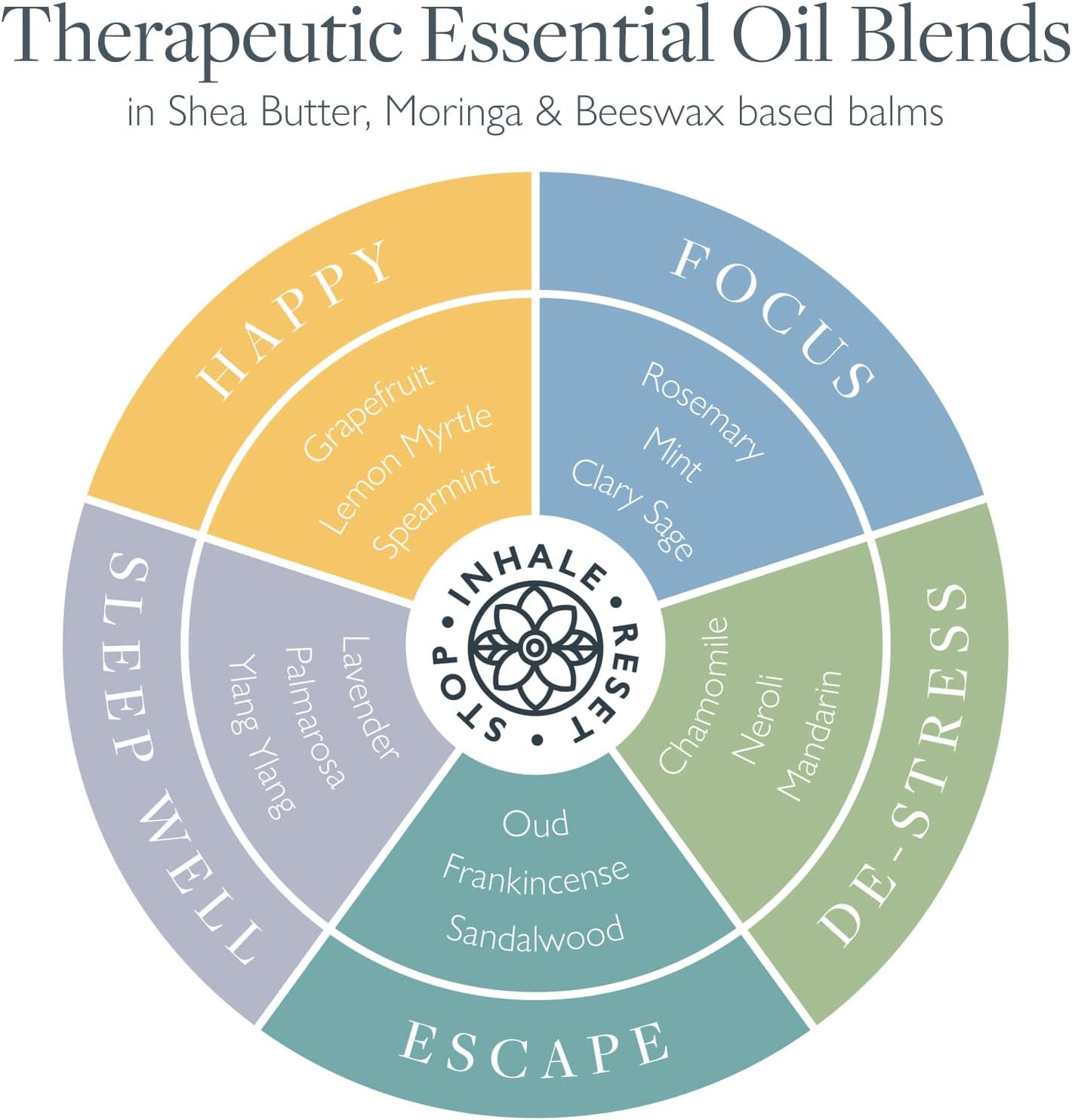 AROMATHERAPY BALMS WITH UNIQUE BENEFITS – This set includes mini versions of our signature balms: ‘Focus’ to enhance concentration, ‘Sleep Well’ to promote restful sleep, ‘De-Stress’ for relaxation, ‘Escape’ for meditation, and ‘Happy’ to boost your mood. Each balm offers a specific benefit, making this collection perfect for any situation.