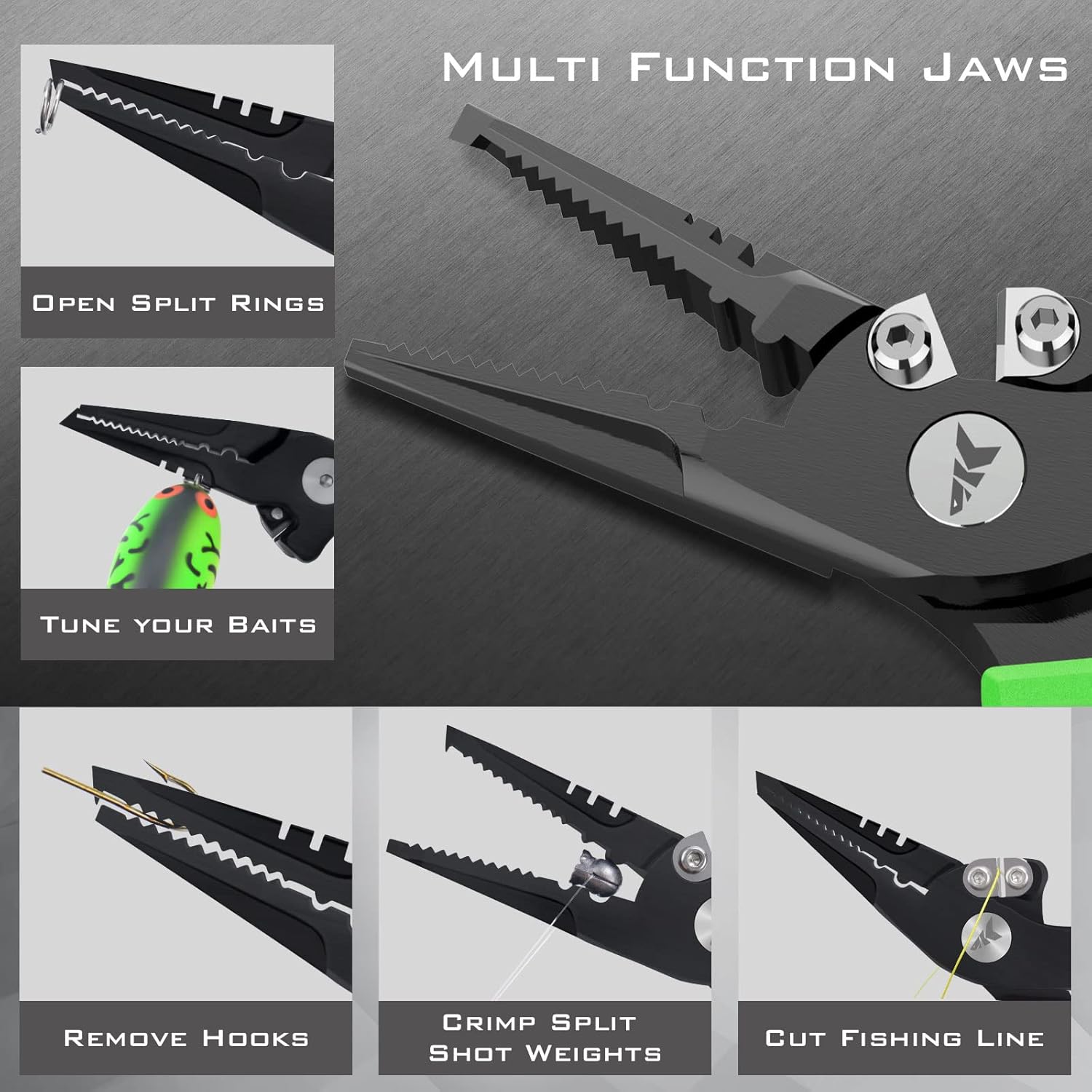 Key Features – Fishing Tools – Corrosion resistant 420 Stainless Steel fishing pliers and fish lip gripper – Durable corrosion resistant coating – Tungsten carbide line cutters slice through mono, fluorocarbon and braided fishing line with ease – Open split rings to change hooks – Tune baits – Crimp split shot or build leaders.