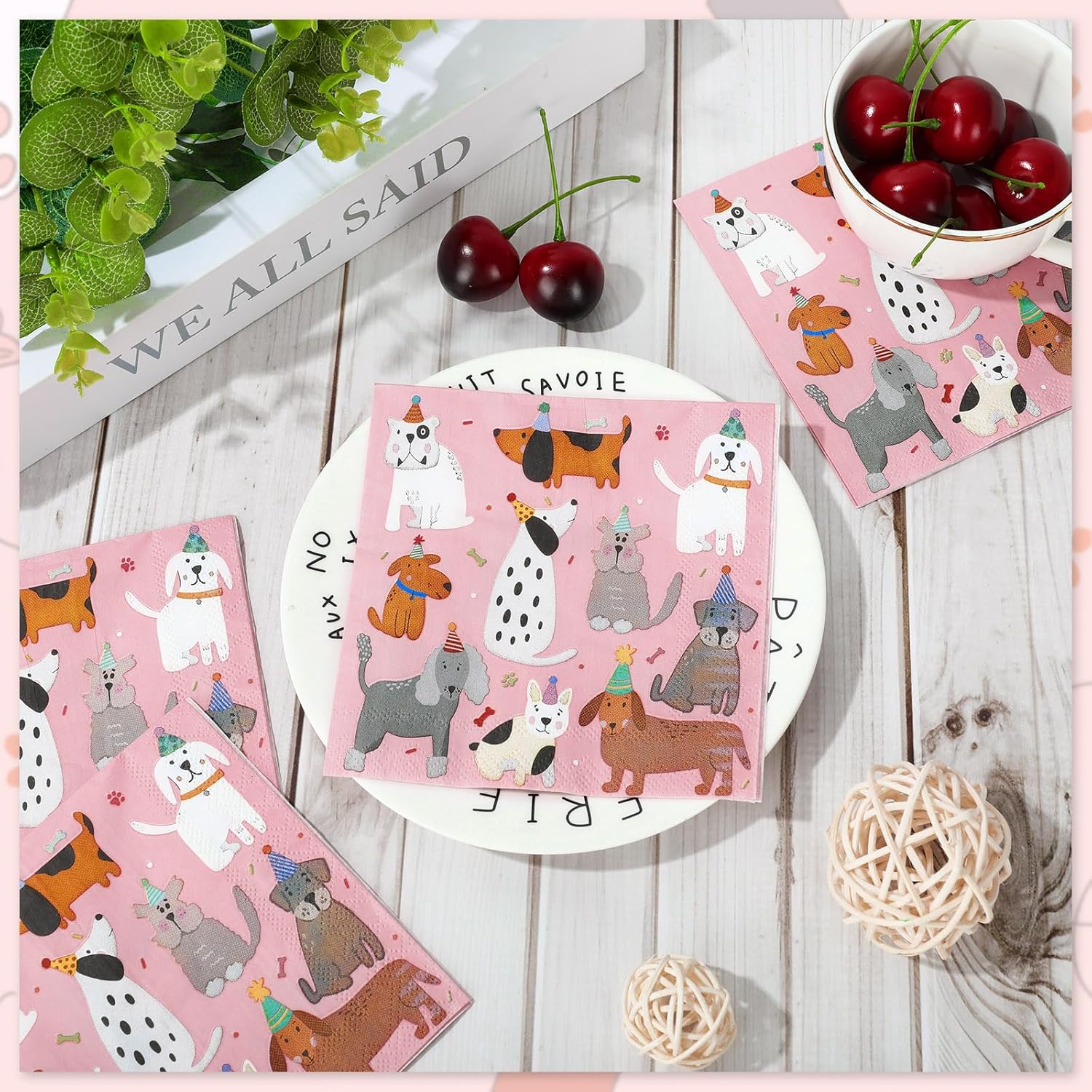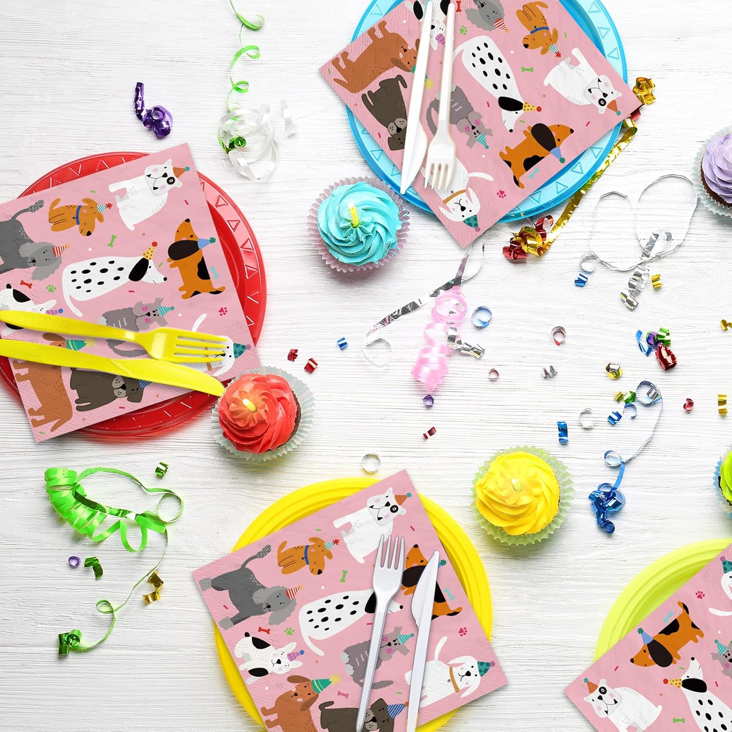 LOVELY DOG PATTERNS: Mainly colored in pink and printed with assorted cute puppies in carton style, our paper party napkins are funny and eye-catching, ideal to be party table decor to enrich more happy atmosphere.