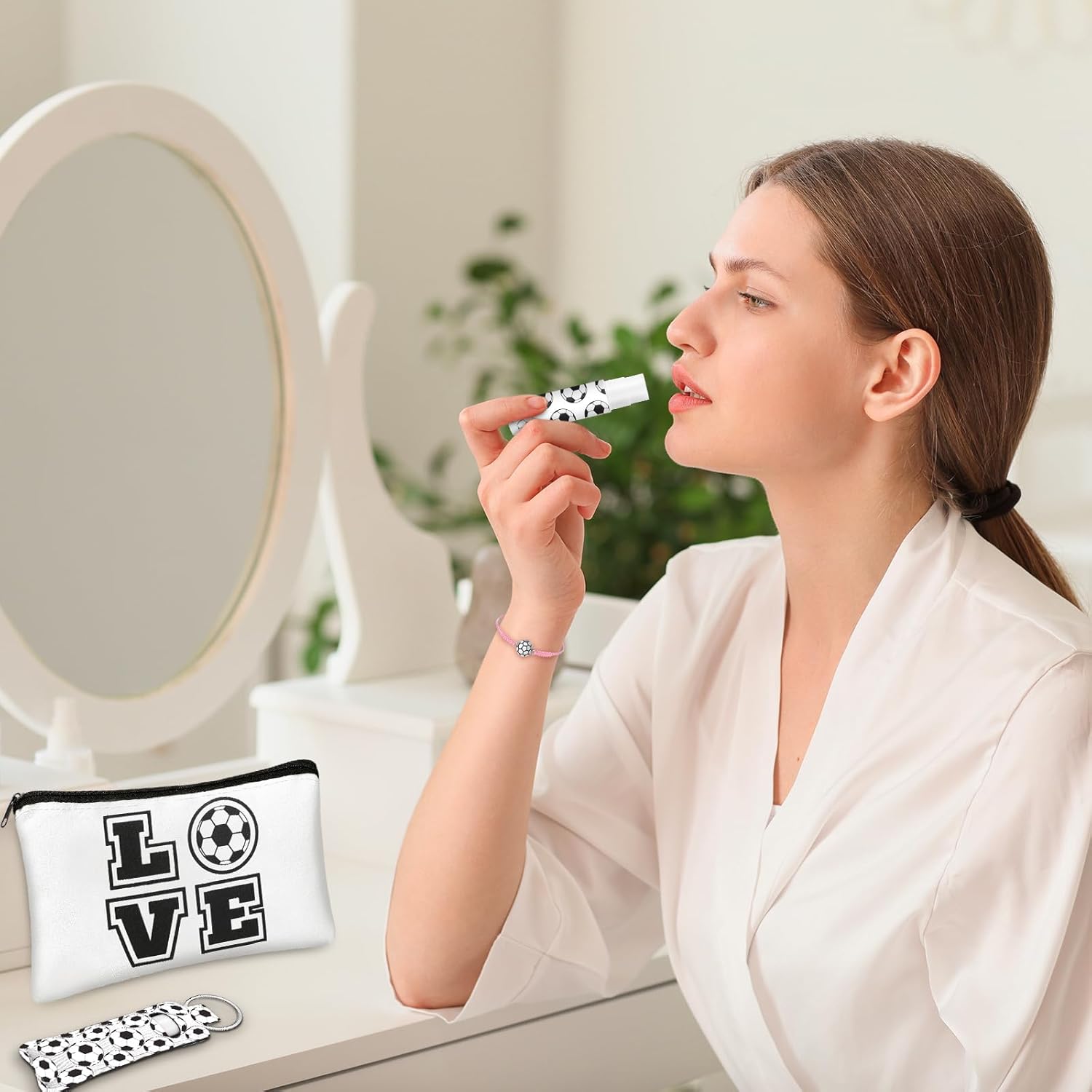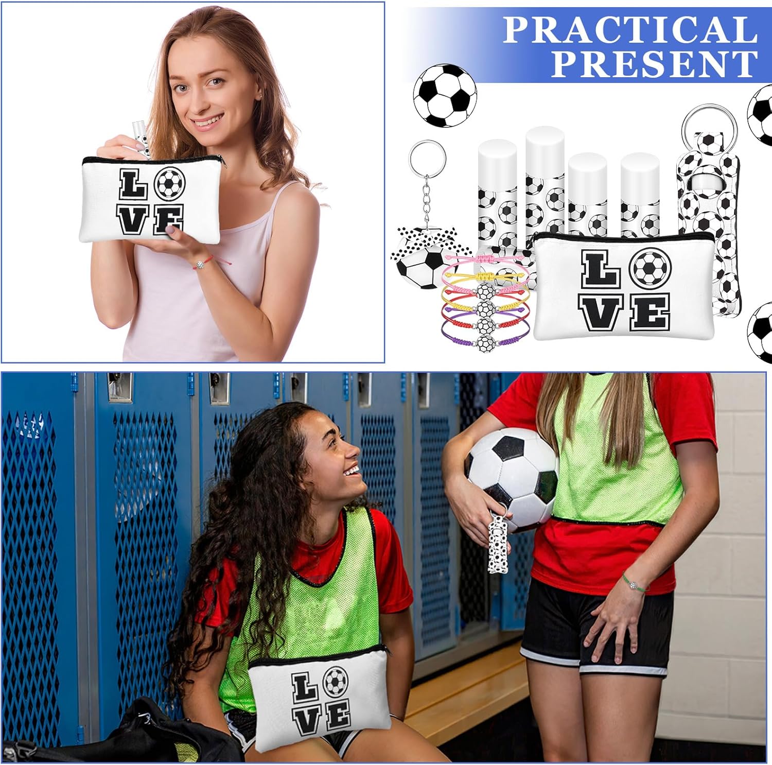 12 Set Soccer Team Gift Include 12 Makeup Bags 12 Lip Balm 12 Lip Balm Holder 12 Soccer Keychains 12 Charm Bracelets for Teen Girls Boy Players Team Sports Supplies