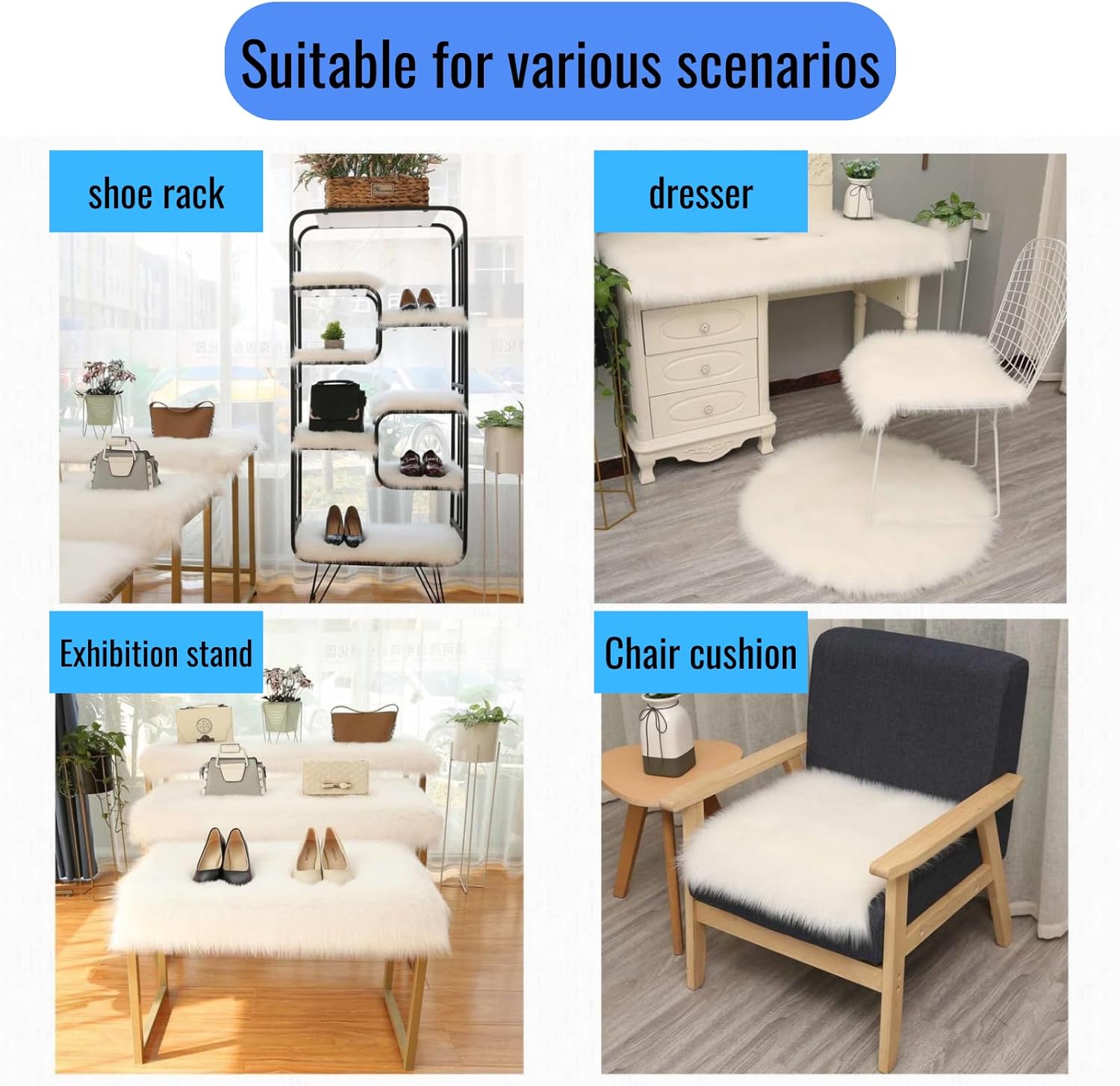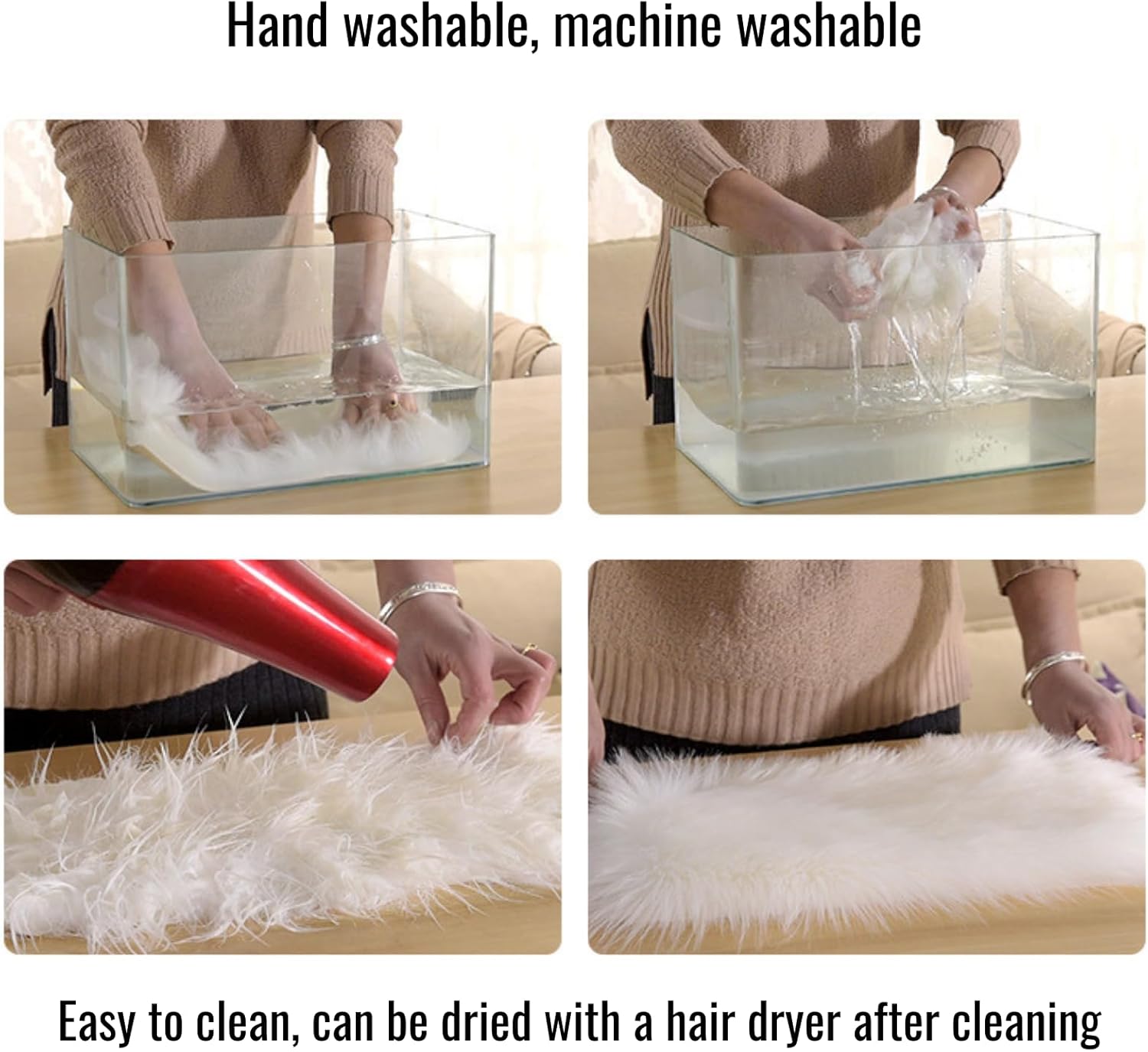 【Durable and Strong Backing】This fluffy rug has wear-resistant bottom with soft suede leather lining perfect for wooden or other material surfaces. Neat stitches enhance strong connections at seams ensuring the faux fur rug’s durability and longevity
