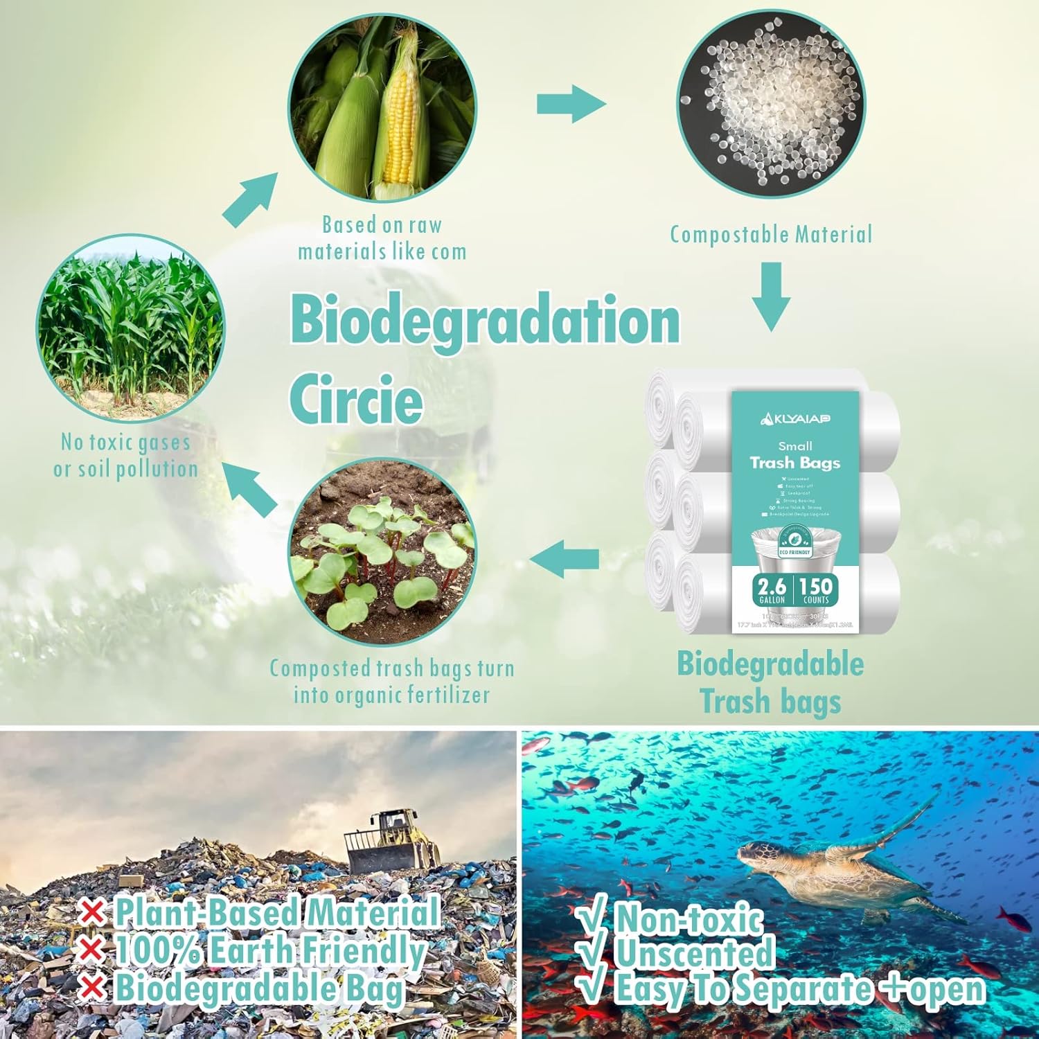★【BIODEGRADABLE 2.6 GALLON TRASH BAG UNSCENTED】: Aklyaiap bathroom garbage bags are made of plant-corn starch material (PSM), which are eco-friendly without causing damage to the environment. Also kitchen garbage bags don’t have any scents to keep your kitchen free of noxious trash odors! Recyclable small bathroom trash bags are Cost-effective !