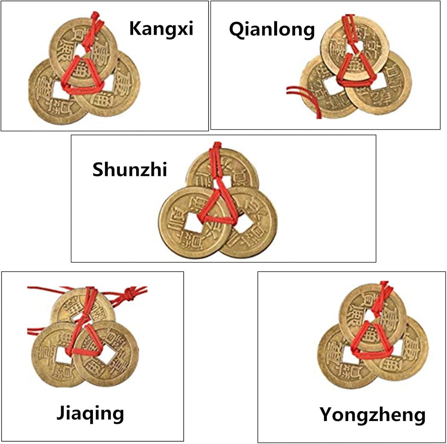 【Meaningful Theme】Chinese knot lucky coins include 5 imitation Ching-Dynasty-style coins printed clear names of emperors, Qianlong, Yongzheng, Jiaqing, Shunzhi and Kangxi, people believe that can attract good luck and enhance positive Chi for health and wealth when hang them.