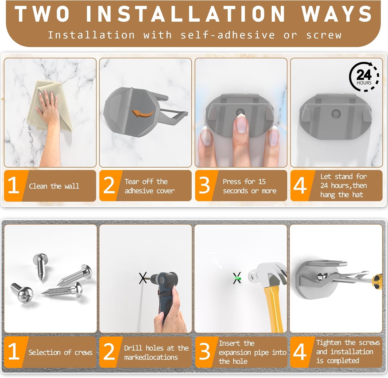 Easy Installation: Our wall mounted hat hangers can be installed using the included adhesive or screws. Note: For longer lasting adhesion of the hat holder, after tearing off the protective film of the adhesive pad to stick the hook to the wall, press it for 15 seconds, then wait 24 hours before hanging the hat. When removal is necessary, we recommend heating the adhesive on the back of the hook with a hair dryer and then removing it slowly