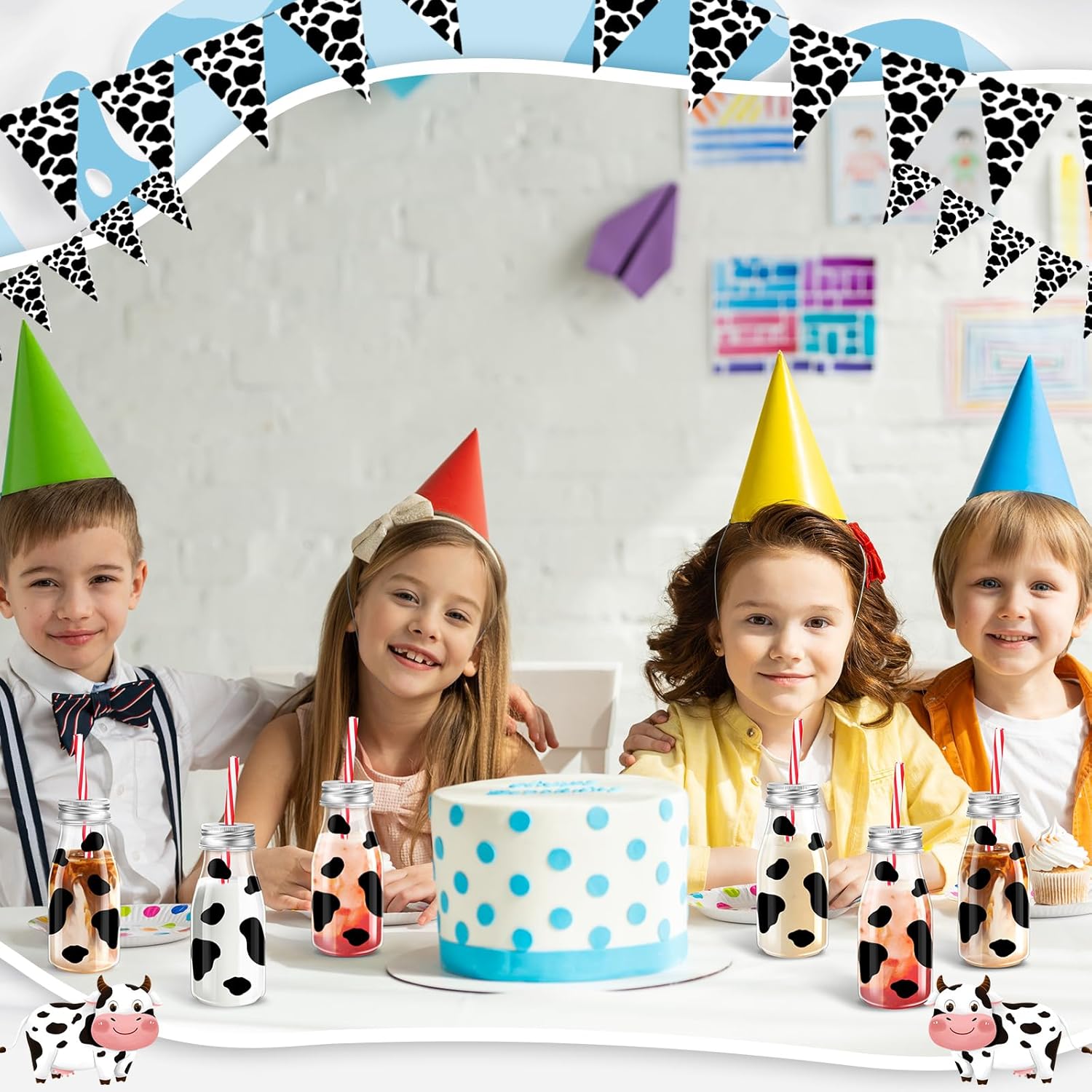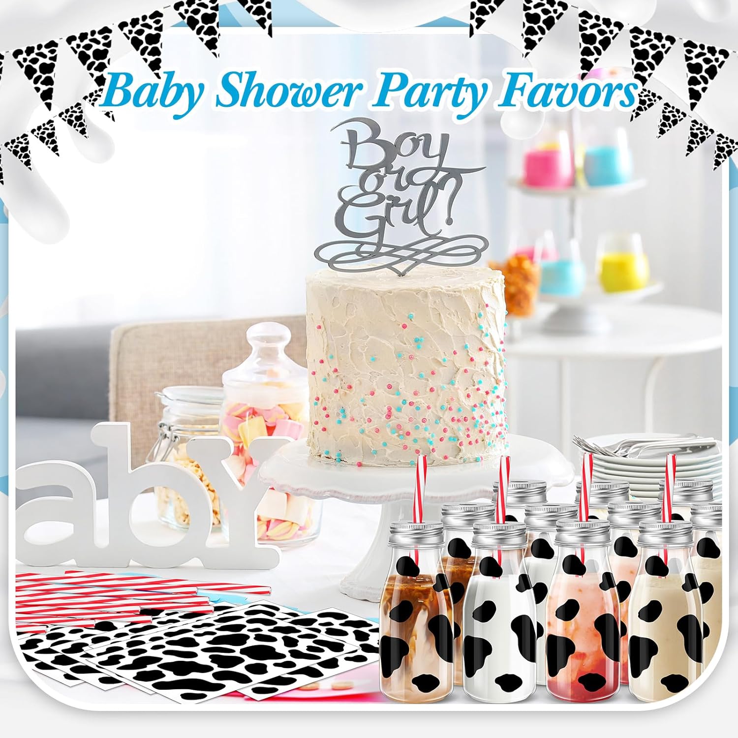24 Set 7 oz Cow Themed Plastic Bottles with Silver Metal Lids Straws Cow Print Stickers Milk Bottle Reusable Milk Jar Beverage Containers for Baby Shower Birthday Cow Party Favors Supplies