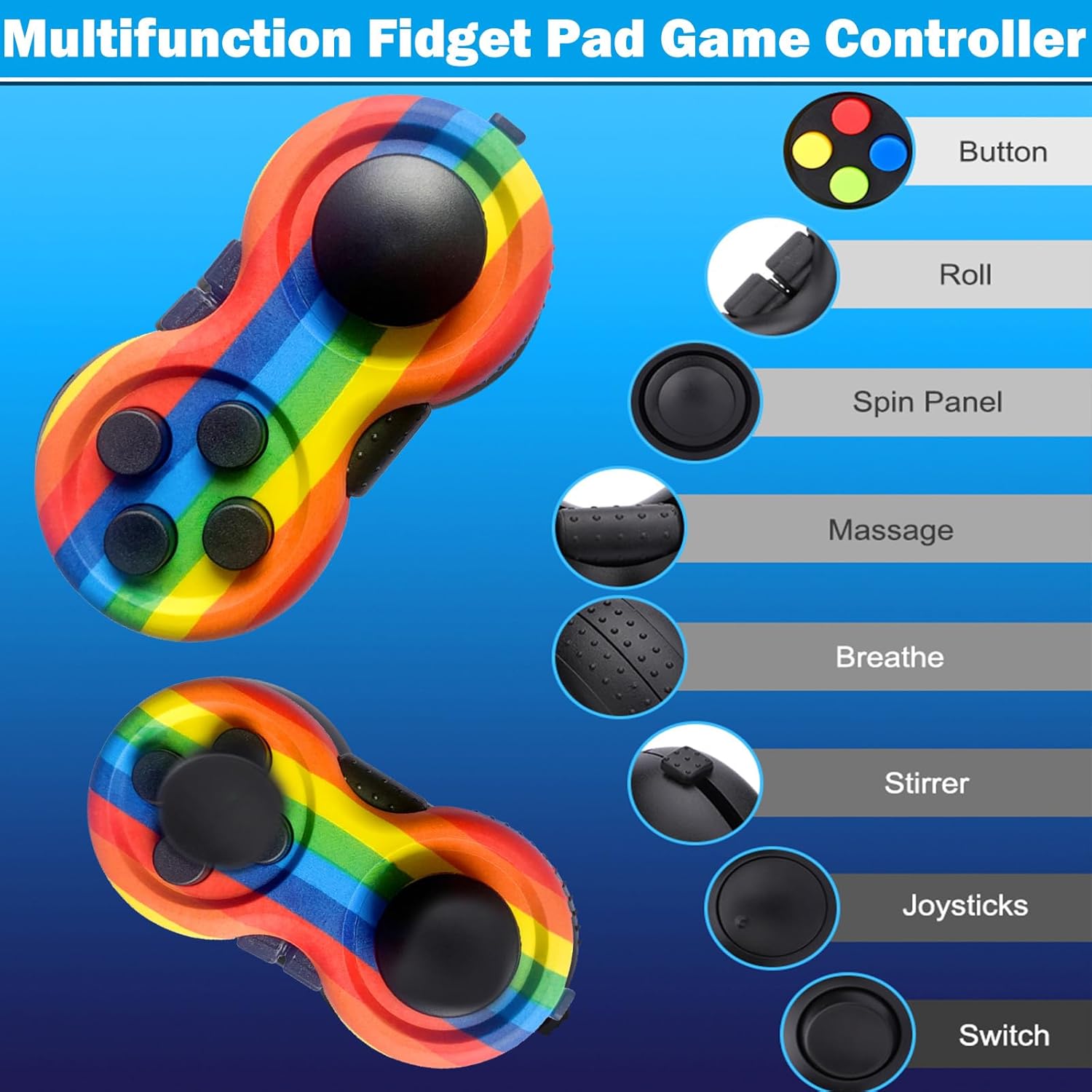 [8 Fidget Functions Fidget Pad ]- Include – A cliker – 4 Press Coloful Buttons (2 Clickable Button and 2 Silent Buttons For Careful Fidgeting) – A Hand Strength Roller – A Sensory Grip Textured – A ON-OFF Switch – A Spinnable Cover- A Spring Loaded Slider – A Grip Textured Section.