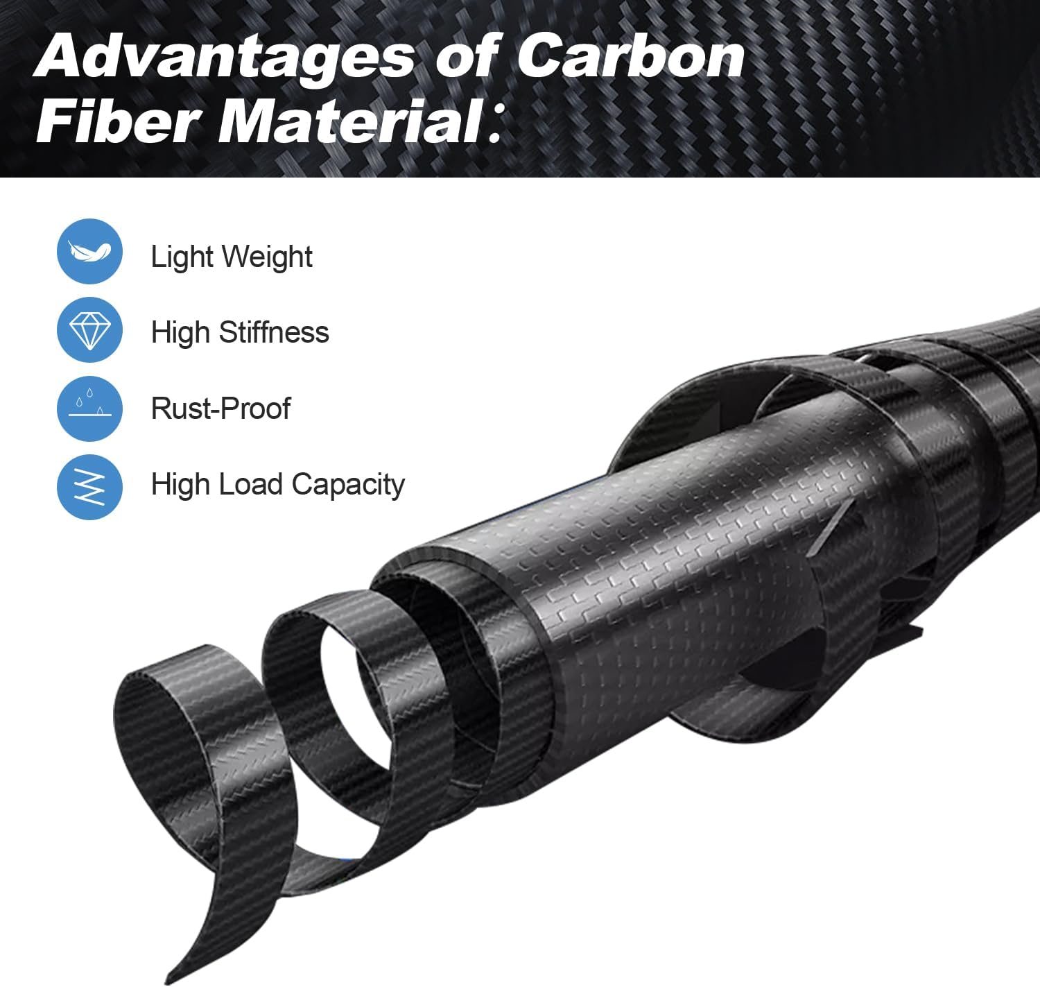 【Carbon Fiber Material】Compared with aluminum, carbon fiber has higher strength and rigidity. Our extension rod is made of carbon fiber material, which improves the bending and breaking phenomenon of traditional poles during use. The rust-proof and high-temperature resistant properties of carbon fiber make the pole more reliable and long-lasting.
