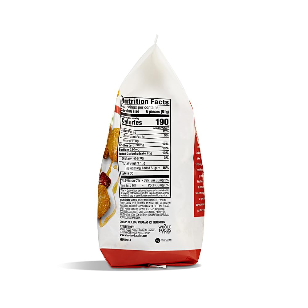 I purchased these when I was placing a Whole Foods order, & this was my first time trying them. Everyone seemed to be raving over them, so I figured I’d give them a try. They come frozen, & you can heat up as many as you’d like at a time. The bag is not resealable, & I ended up having to put it in a larger ziplock to store the remainder because I opened the bag too much. The instructions for the microwave are for 6, & there are also instructions to heat in the oven. It’s super simple, & in less than a minute, they’re ready. First time I tried them, I ate them as a snack plain. They were good. For the rest of the bag, I had them with butter and syrup. They taste like a pancake bite should & are great with butter and syrup. Sometimes when you microwave frozen pancakes and waffles, they come out extra chewy & don’t really end up like pancakes, but these are great. They taste like they are fresh & not frozen. You can have them as a snack or breakfast.