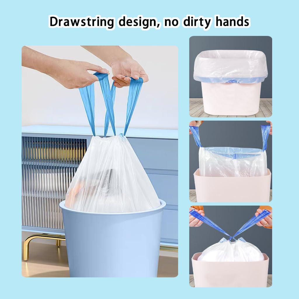 Convenient Drawstring Handles: White trash bag with blue drawstring closure it easy to tie and carry.The design of the drawstring makes it more convenient to take out the garbage .The drawcord seal quickly locks the garbage smell.