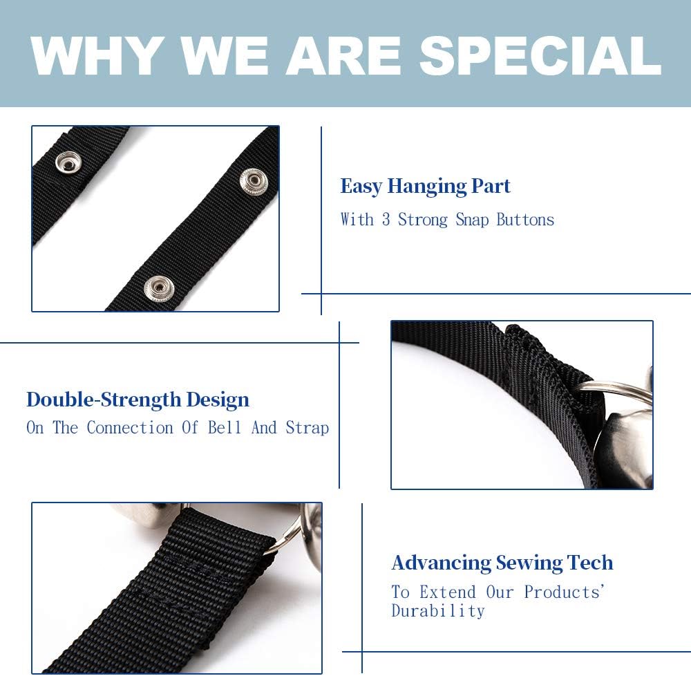 PREMIUM QUALITY – This product is crafted with heavy-duty nylon straps and designed to last. The seven large silver-coated, rust-resistant bells produce a loud but delightful sound. We have also doubled the strength on the connection for long-lasting use.