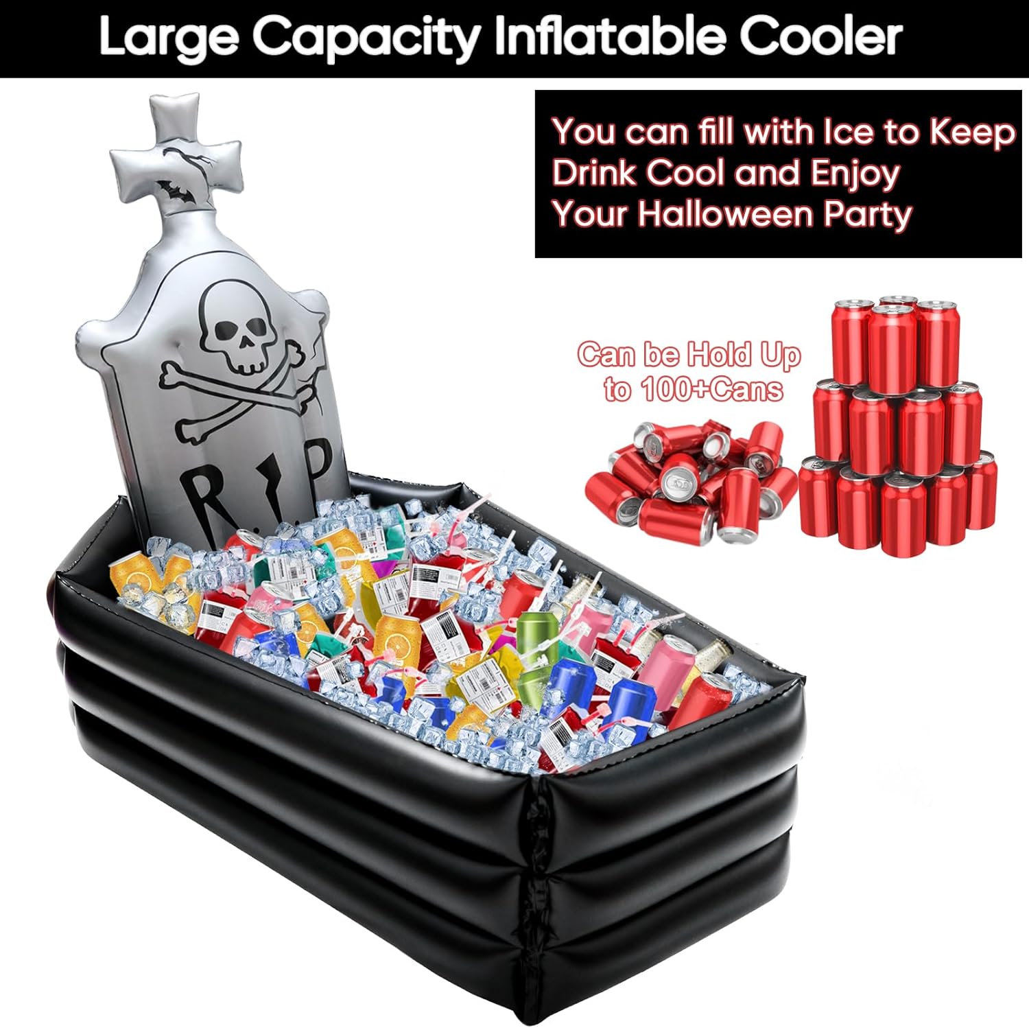 【Graveyard Halloween Inflatable Cooler】:44inches Halloween inflatable cooler, which can hold up to 120 cans of 12 oz drinks or 40lbs of ice, Fill the bottom of the coffin with ice and any can or bottled drink of your choice ,keep drink cool many hours. Can also be filled with candy or toys for more fun. It’s a great choice for Halloween party decoration supplies, preparing it and enjoy your party.