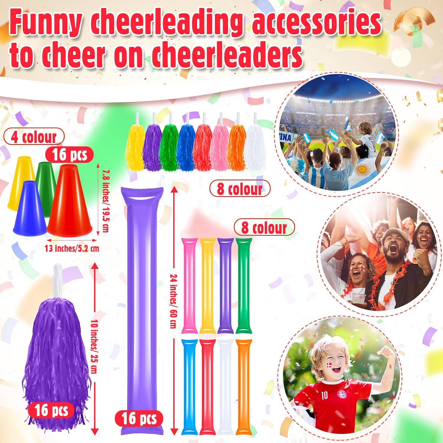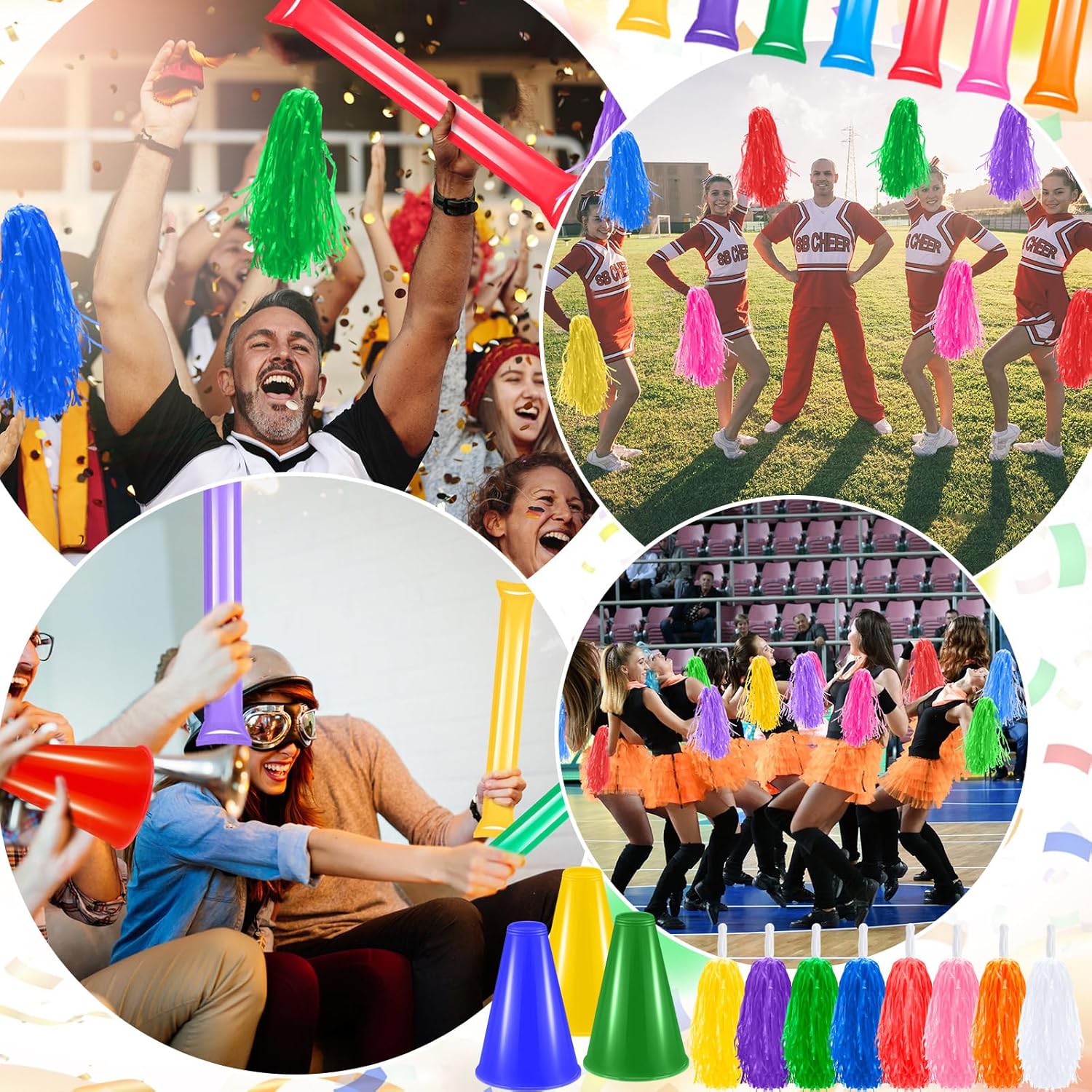 Abundant Quantity for Various Events: with a package that includes 16 cheer megaphones in 4 colors, including blue, yellow, green, and red, 16 cheer pompoms in 8 colors, including red, blue, green, yellow, pink, purple, orange, and white, and 16 thunder sticks in 8 colors, including red, blue, green, yellow, pink, purple, orange, and white; Whether it’s a large sports event or a series of parties, this quantity ensures that everyone can participate and show their support