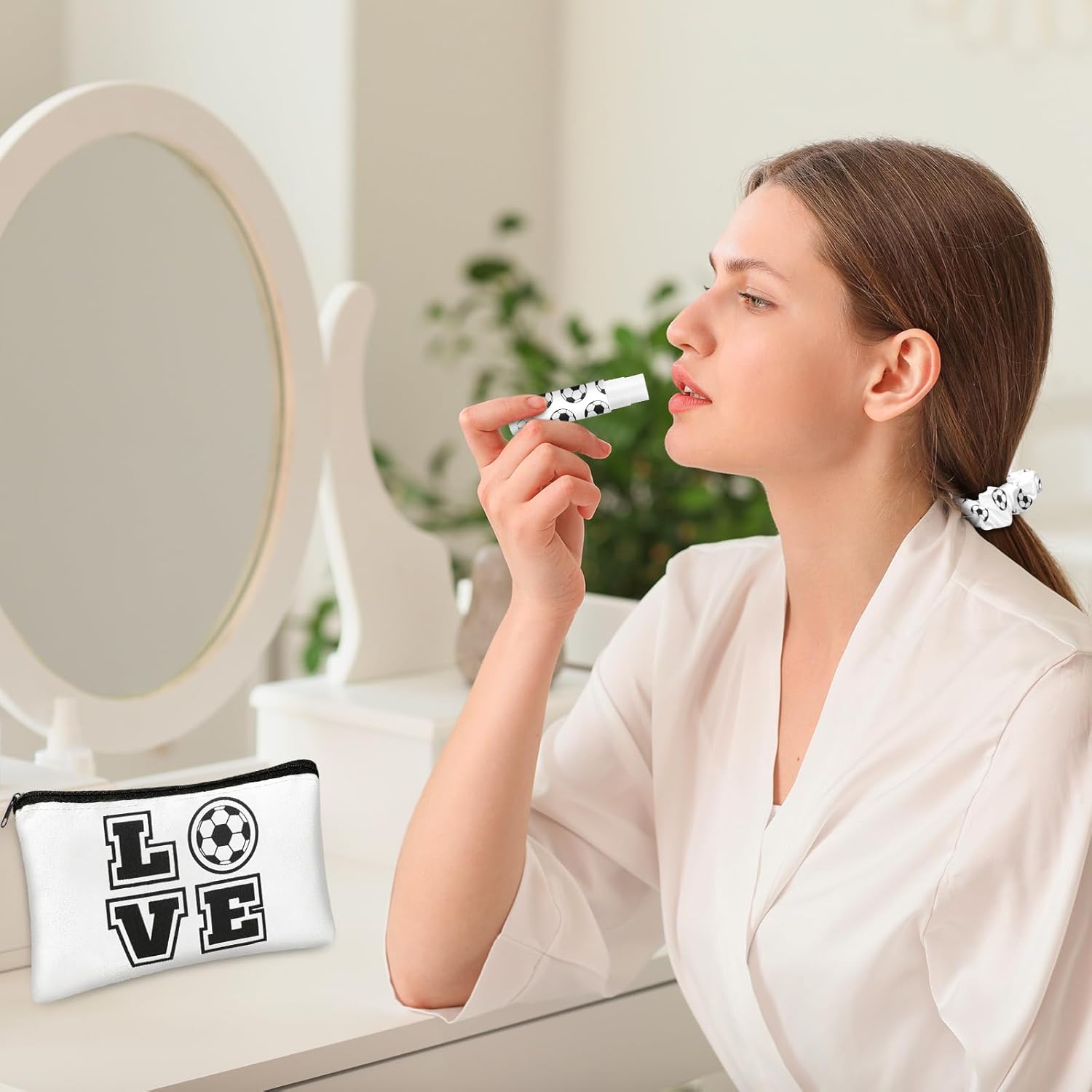 Soccer Themed Style and Diverse Package: delight in the glorious blend of style and quantity in our soccer themed gifts; The package features 12 polyester makeup bags, 12 sports elastic hair scrunchies, 12 lip balms, and 12 lip balm holder sleeves, making this the ideal soccer gift bundle for lovers of the sport
