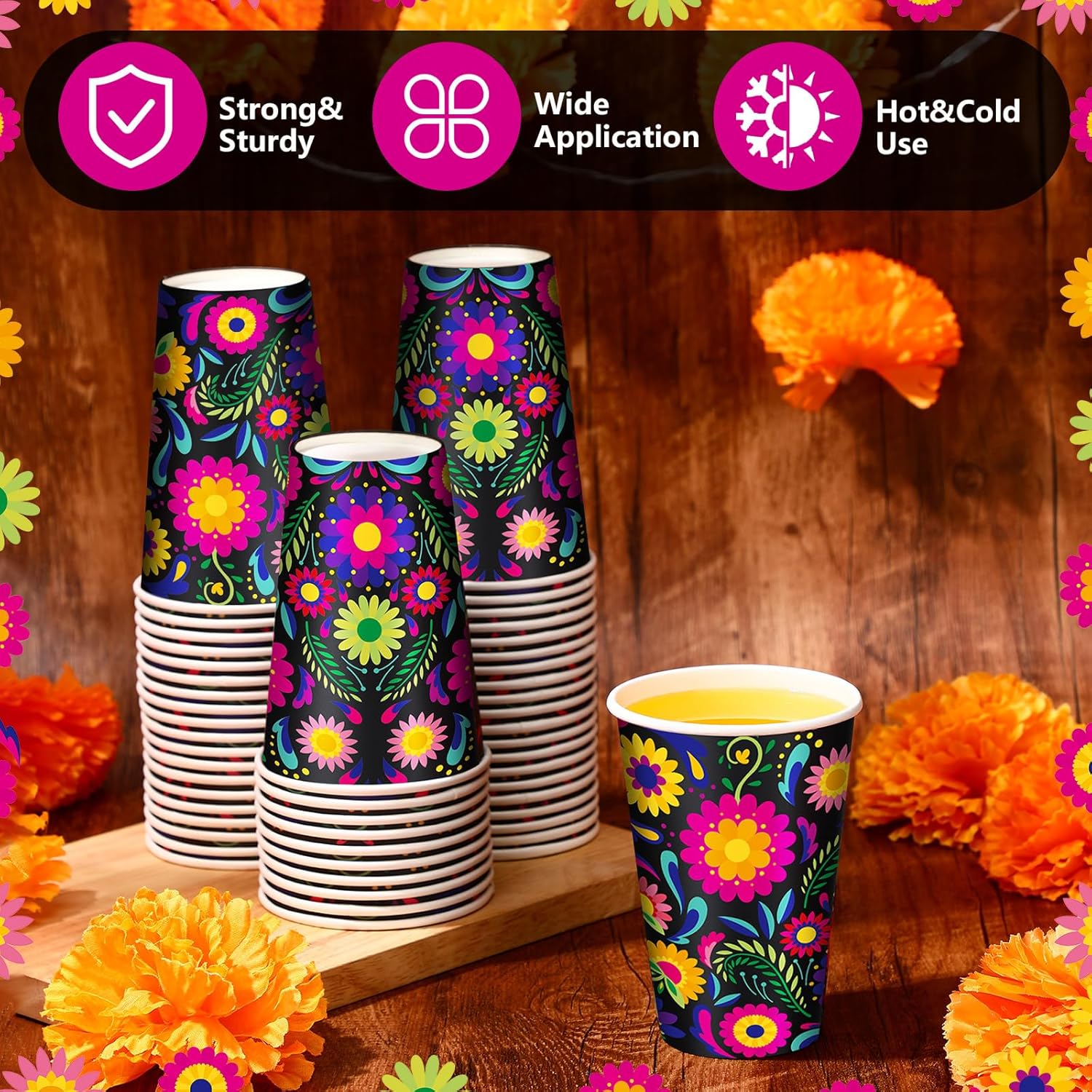 Sufficient Capacity and Suitable Size: these Mexican floral paper cups have a capacity of about 12 ounces and measures approximately 4.33 x 3.15 x 2.09 inches/ 11 x 8 x 5.3 cm, nice size for holiday parties, whether it’s hot coffee, tea, hot chocolate, or cold water, juice and soda, these cups can easily accommodate it, making your drink choices more diverse and ideal for holiday parties