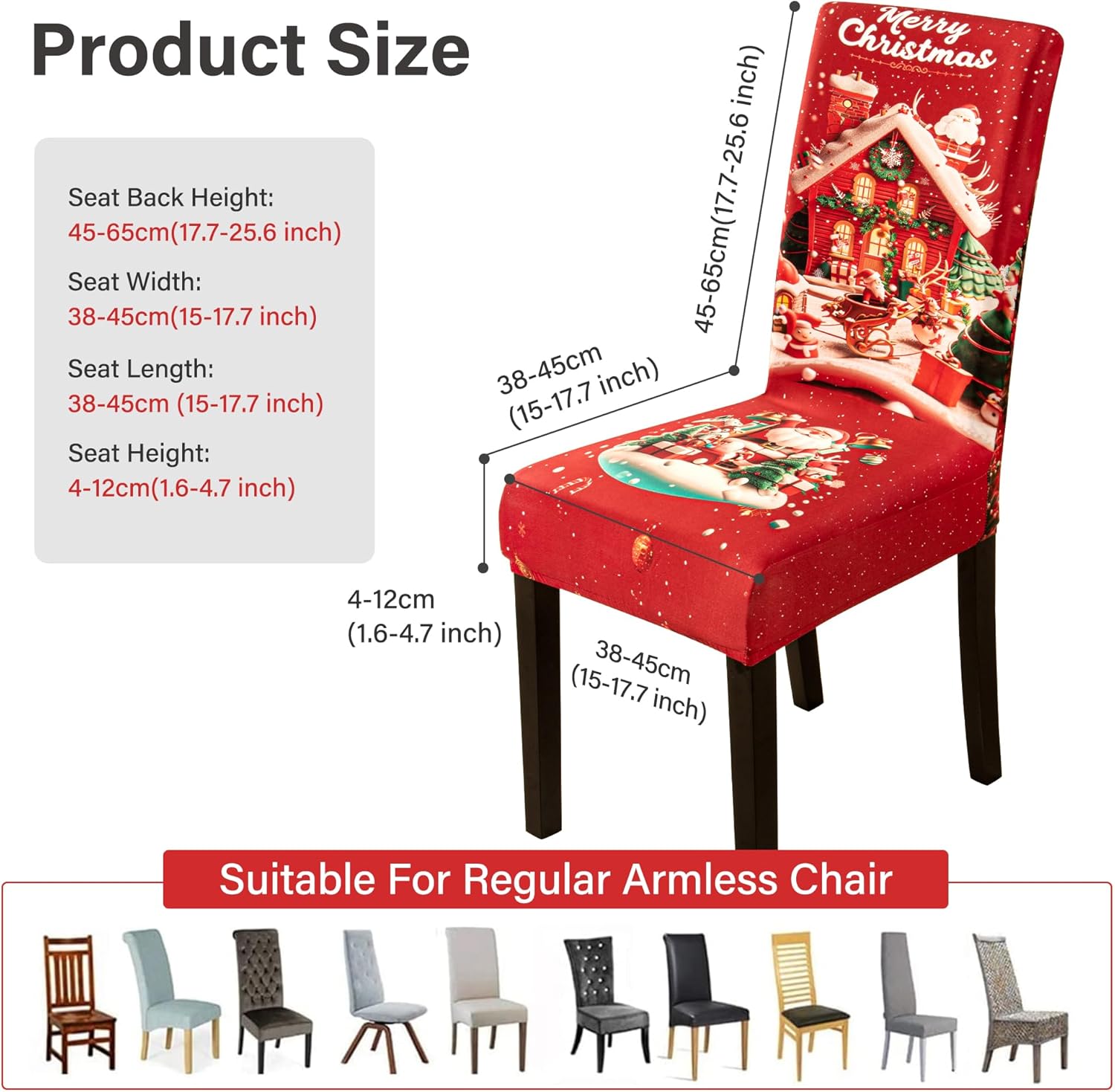 【Suitable for Most Armless Chair Size】Back Height:45-65CM (17.7-25.6 inch); Seat Length: 38-45CM (15-17.7 inch); Seat Width: 38-45CM (15-17.7 inch):Seat Height: 4-12CM (1.6-4.7 inch) ,This Christmas chair cover fits most standard kitchen dining chairs, which is a general and regular size for many different types of chairs; Please check the measurement guide, measure your chair before buying to make sure it is the right size. (due to manual measurement, please allow 0.5-1 inch error)