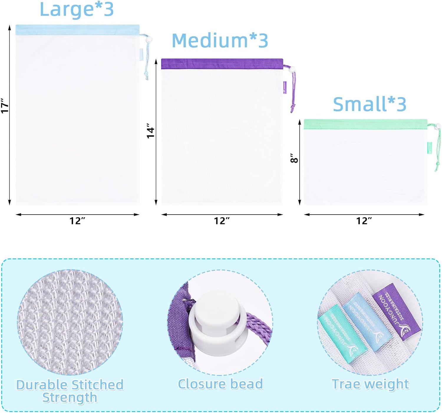 Multiple Sizes and Colors: Reusable produce bags Size and quantity matter. 9 pieces in 3 sizes are carefully selected for your use. Kit includes 3 small (12″x8″), 3 medium (12″x14″) and 3 large (12″x17″) sizes. Dimensions (S/M/L) are printed with coded labels and drawstrings for easy identification and organization.
