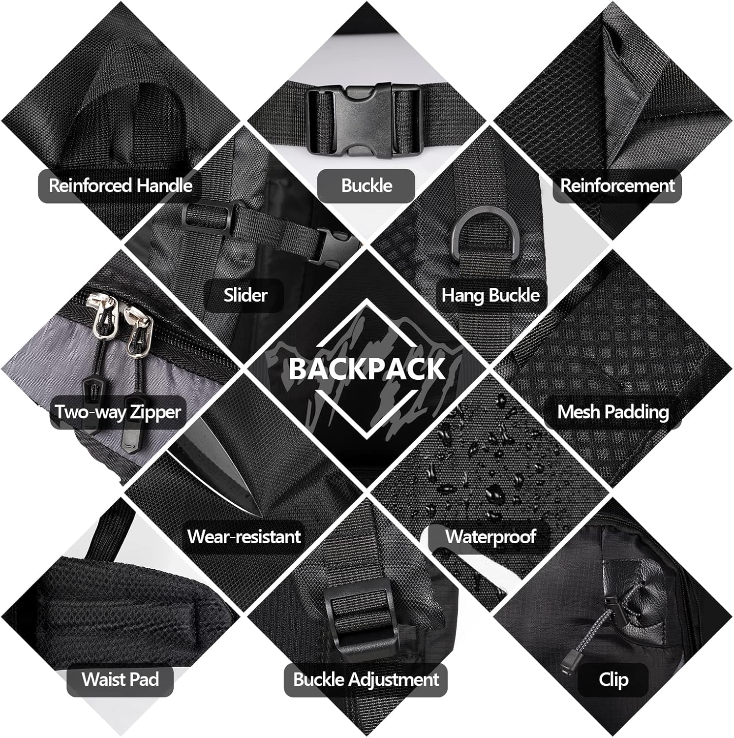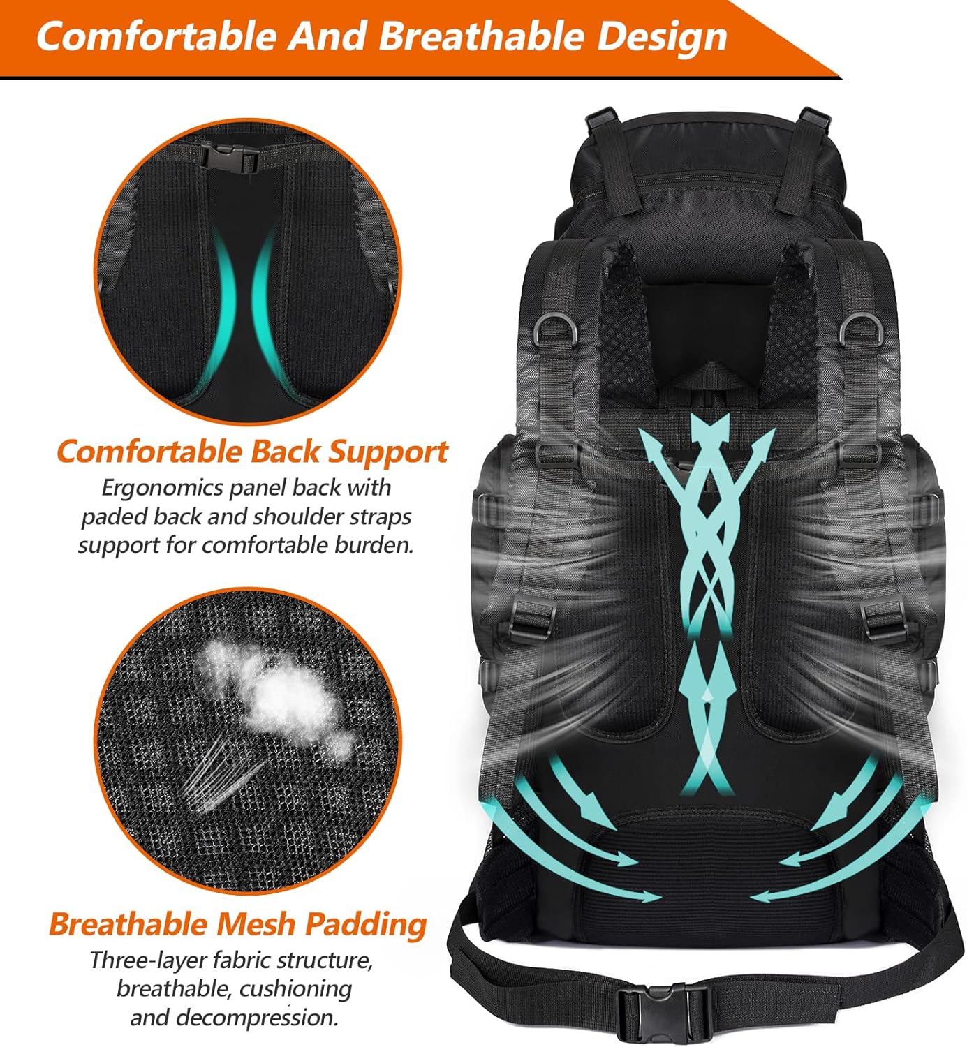 【Durable Camping Backpack】Double-line shell is long-lasting and puncture proof; Shape-forming backer board and multiple compression straps provides strength and stability. Strong shell for the most rugged hiking and camping adventures; Multiple compression straps, strong buckles and storm proof zippers; Included rain cover you and your backpack.