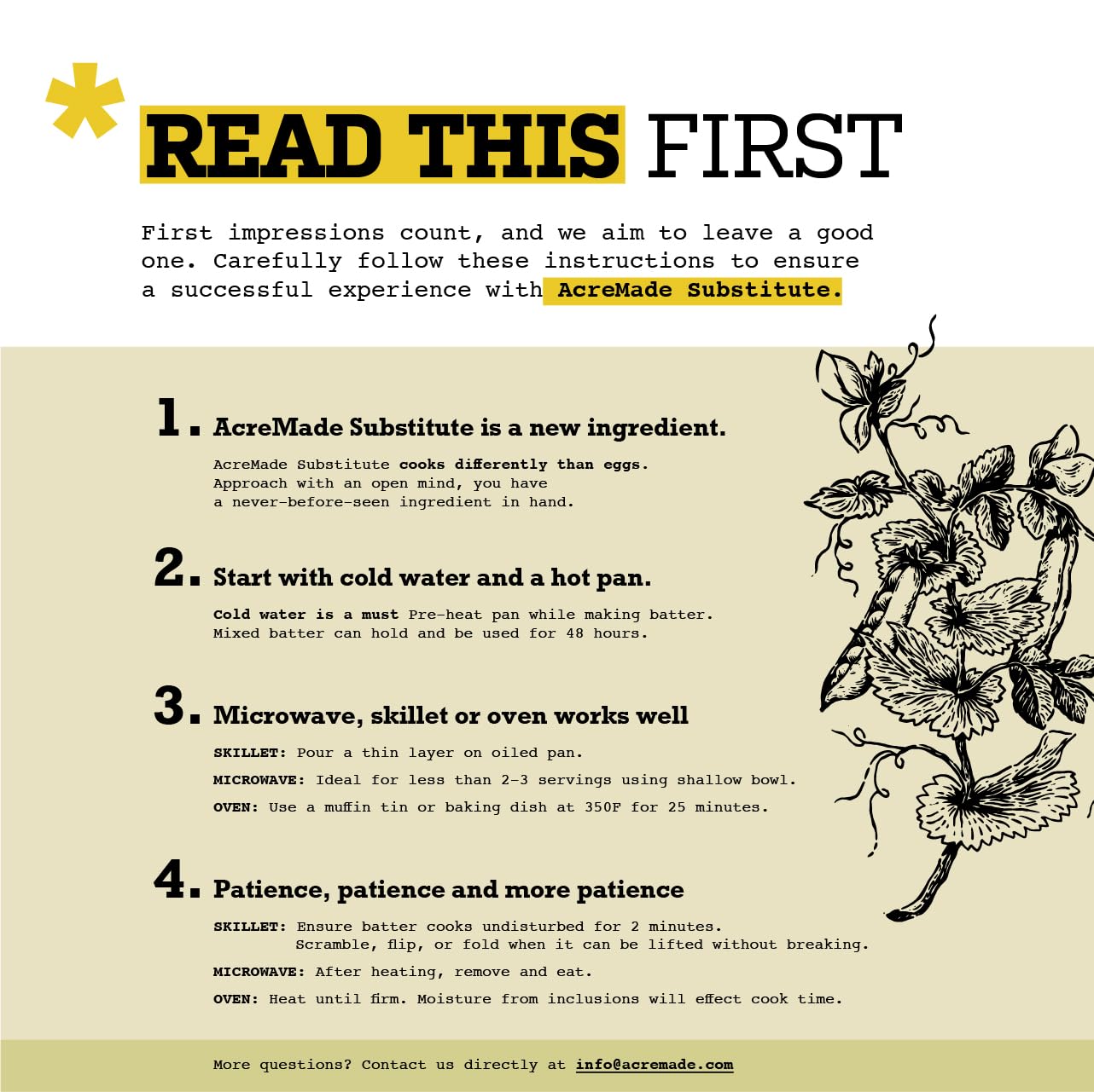 NON-GMO NUTRITION: Made from non-GMO pea protein manufactured in the USA, our products are resilient in the face of ethical and disease related concerns. AcreMade Egg Substitute contains 5 grams of protein per serving, no cholesterol or saturated fat.