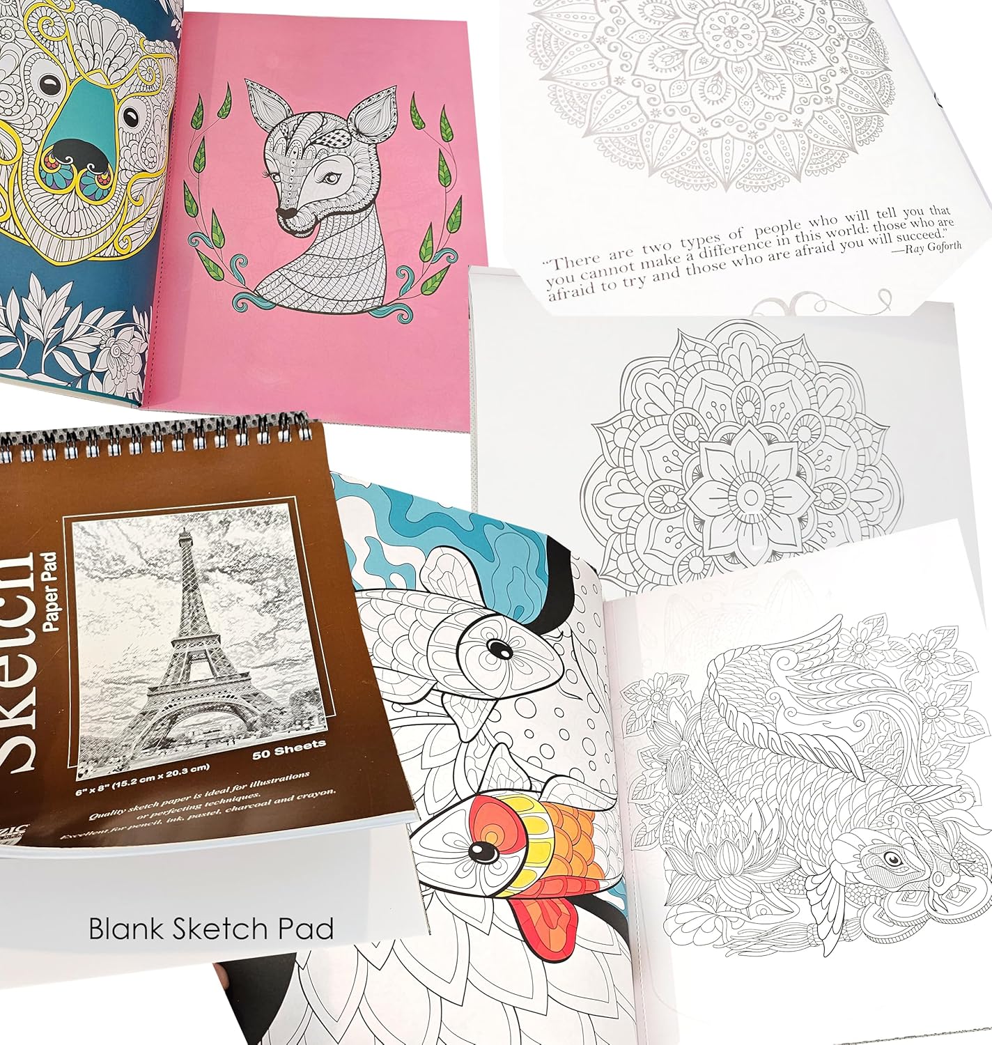 The coloring books are random, 2 mandala and 1 animal book. The books are inconsistent, some pages are perforated and some are not. Some designs go right into the binding. Some have pre-colored areas in the artwork. The animal book has artwork on the front and back of each page. For the mandala books, some have front and back artwork, some do not.