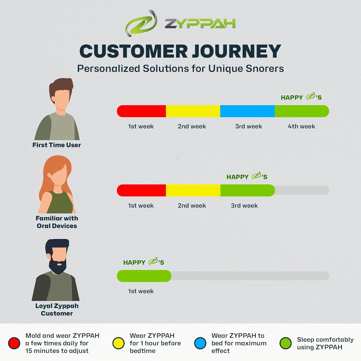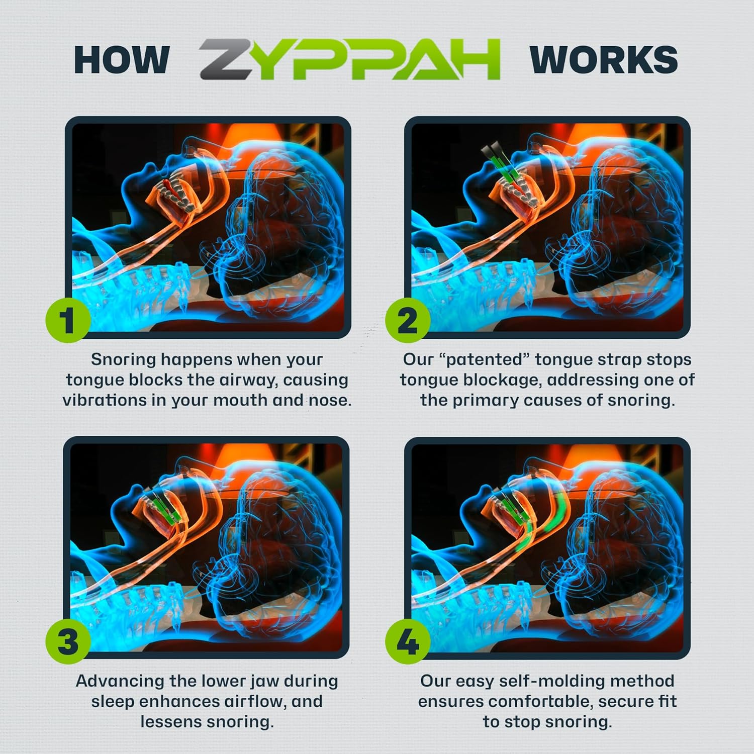 Welcome to the ZYPPAH family! Introducing a new and improved version of our ZYPPAH anti-snoring mouthpiece for an upgraded and more comfortable experience! Our mouthpieces were made with you in mind—we take everybody’s sleep seriously, and ZYPPAH was born from a desire to help every night be the best night’s sleep of your life. Your personal health is directly tied to your sleep quality. Snoring can impact both how much oxygen your brain is getting and how well you’re sleeping at night. The ZYPPAH Anti Snoring Appliance aids through its innovative hybrid design; while helping to advance the lower jaw, it also acts as a seatbelt for the tongue using our patented, new and improved elastic tongue strap giving you a more comfortable experience. The device is lightweight, only 1.76 ounces, and one size fits most—men and women both. The product case measures at 2.5 x 3 x 1.25 inches. Deciding to take back your night is the first step in your journey; a ZYPPAH product means that you’re dedicating time to better sleep. It gets easier the longer you break in your device, giving your jaw and brain time to acclimate to it. Before long, you and your bed partner will wake up feeling more refreshed and ready to take on the day. More than just another snoring aid, it is the only product on the market that has been tested clinically in a medical trial and proven to work. Wake up feeling better and more energetic after getting a solid night’s sleep. Full instructions can be found on our ZYPPAH Amazon store.