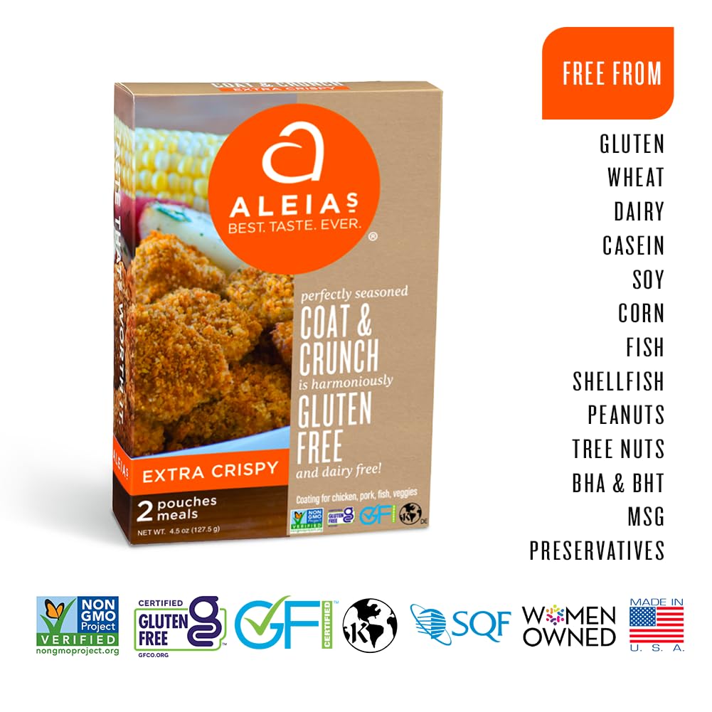 ALL THE GOODNESS: 2 PACK – contains 2 /4.5 oz. Aleia’s Gluten-Free Coat & Crunch Extra Crispy. Made in a facility that is 100% GLUTEN-Free, DAIRY-Free, TREE NUT-Free, PEANUT-Free, SOY-Free, CORN-free, SESAME-free, SHELLFISH-free.