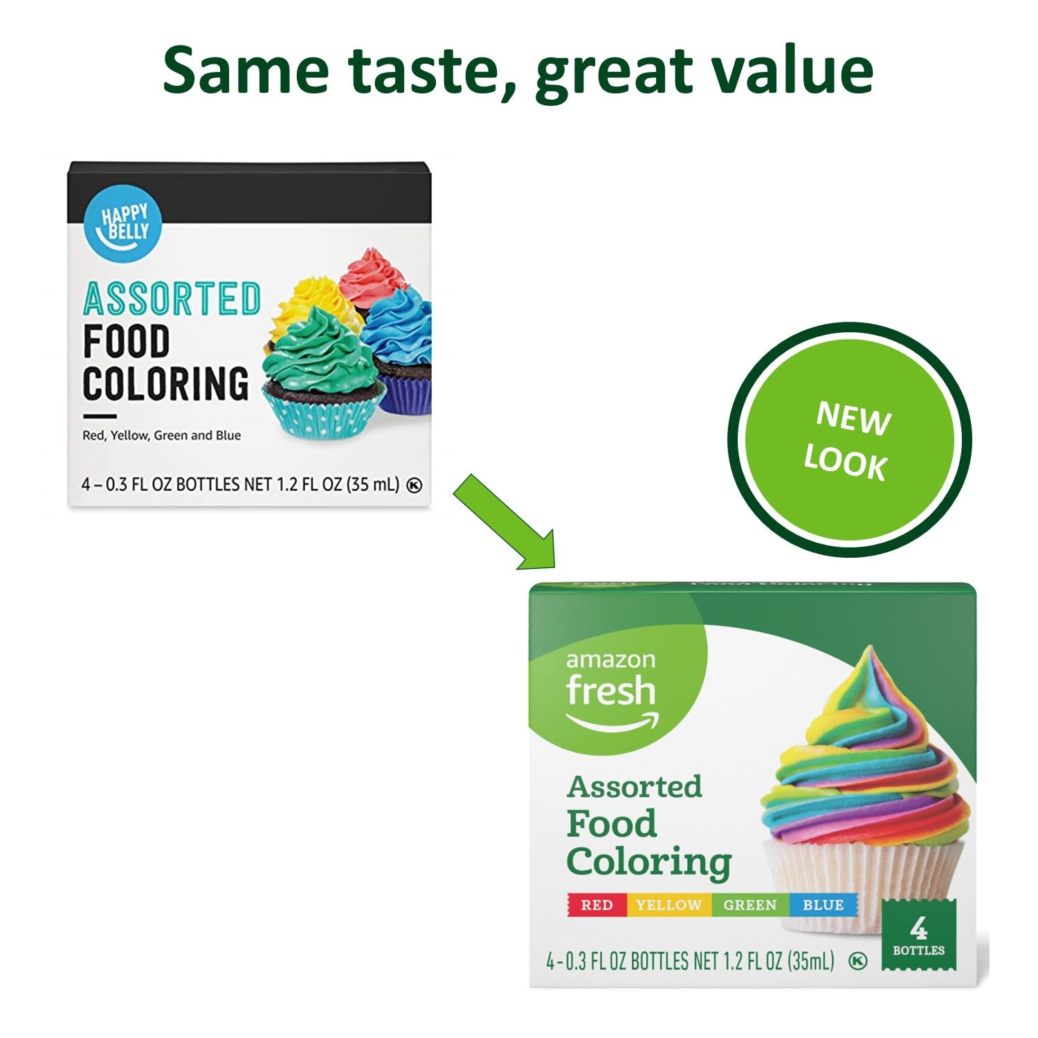 Amazon Fresh, Assorted Food Coloring, 1.2 Fl Oz (Pack of 4) (Previously Happy Belly, Packaging May Vary)