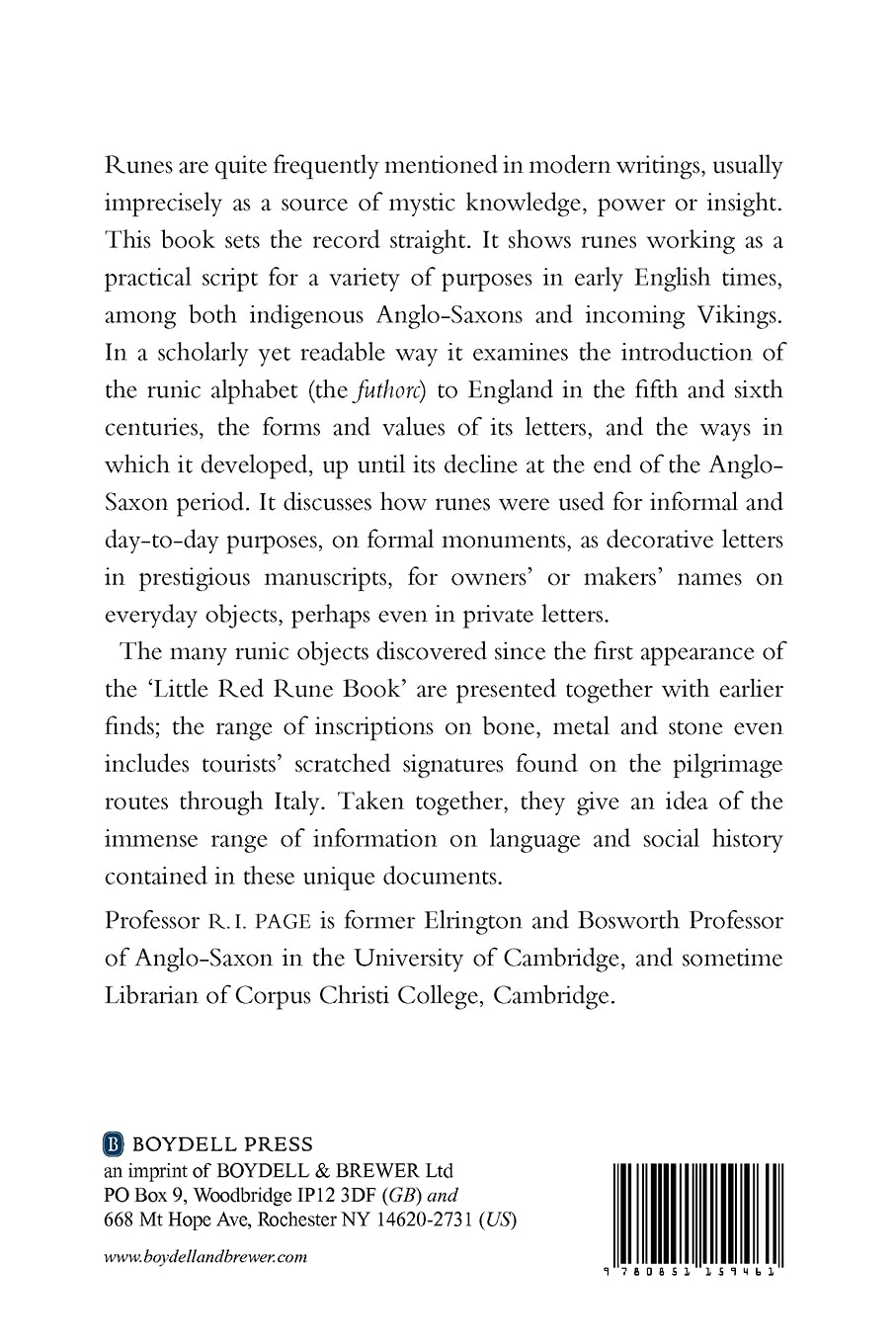 Runes are quite frequently mentioned in modern writings, usually imprecisely as a source of mystic knowledge, power or insight. This book sets the record straight. It shows runes working as a practical script for a variety of purposes in early English times, among both indigenous Anglo-Saxons and incoming Vikings. In a scholarly yet readable way it examines the introduction of the runic alphabet (the futhorc) to England in the fifth and sixth centuries, the forms and values of its letters, and the ways in which it developed, up until its decline at the end of the Anglo-Saxon period. It discusses how runes were used for informal and day-to-day purposes, on formal monuments, as decorative letters in prestigious manuscripts, for owners’ or makers’ names on everyday objects, perhaps even in private letters.