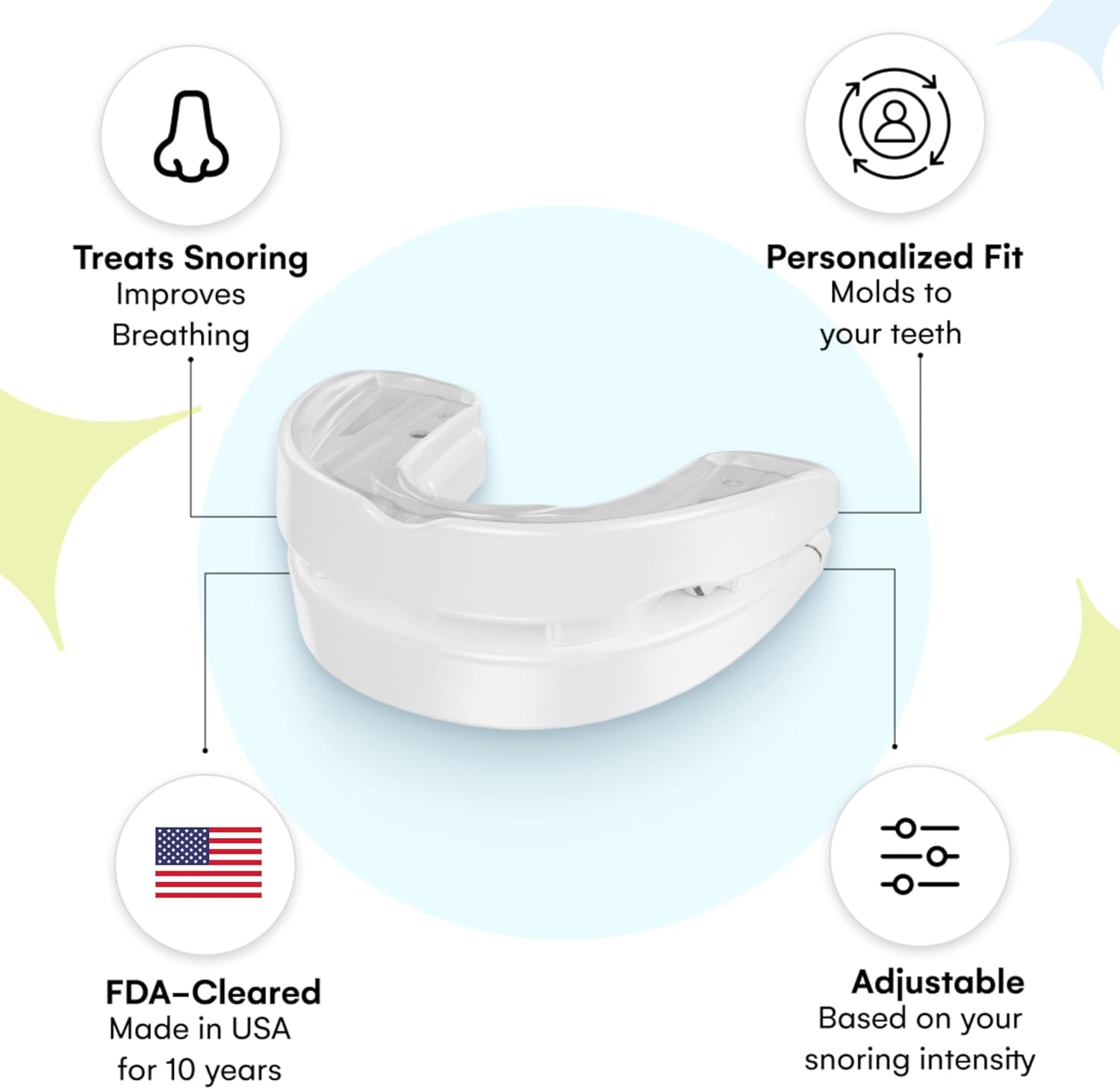 This FDA-cleared oral appliance for snoring, proudly made in the USA, works by gently advancing the jaw, expanding the airway, and significantly diminishing snoring, promoting peaceful and uninterrupted sleep.
