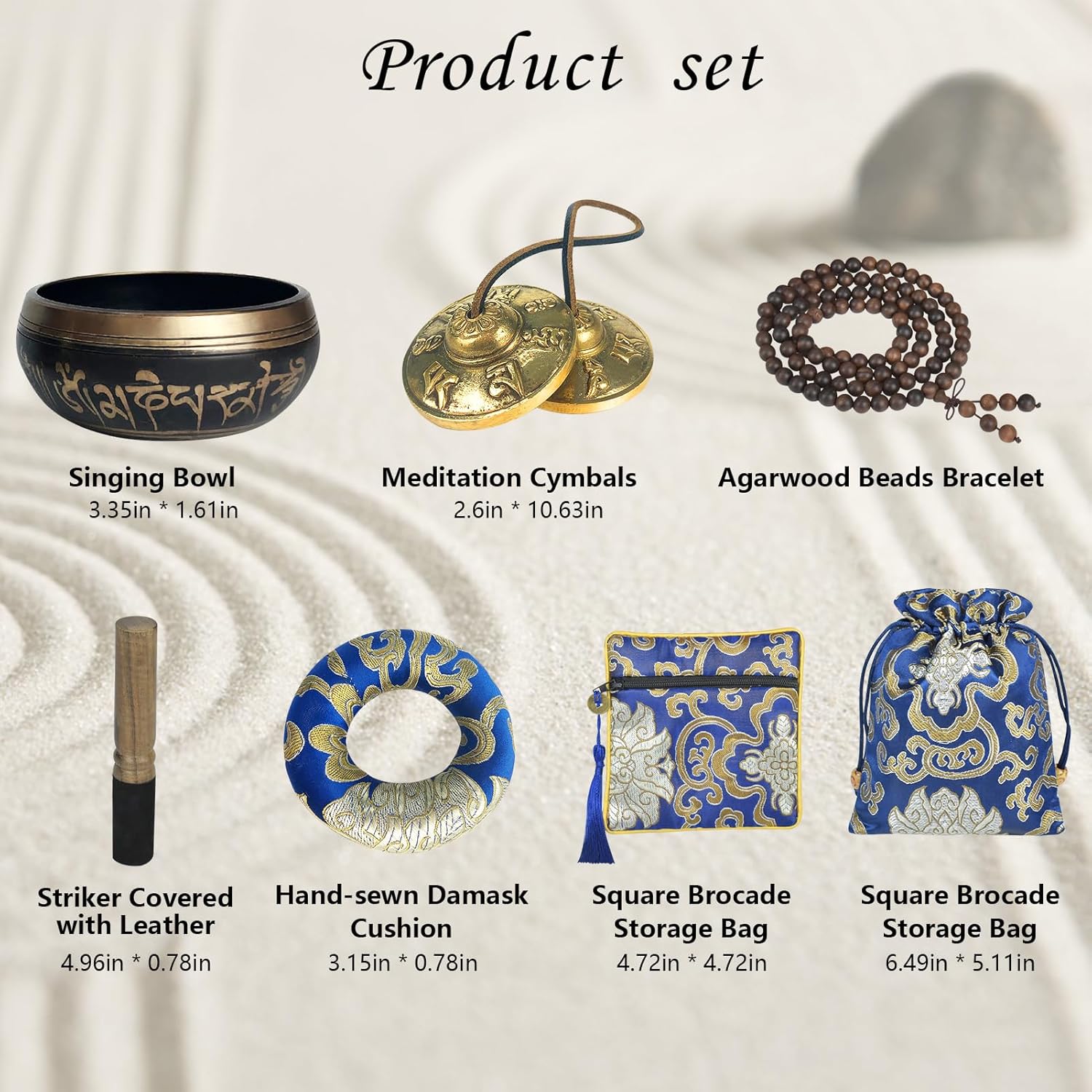 COMPELETE SET: Singing bowl(3.35″) x 1, a pair of meditation cymbals(2.6″) x 1, agarwood beads bracelet x 1, hand-sewn damask cushion x 1, striker covered with leather(5″) x 1, brocade storage bag x 1, square brocade storage bag x 1