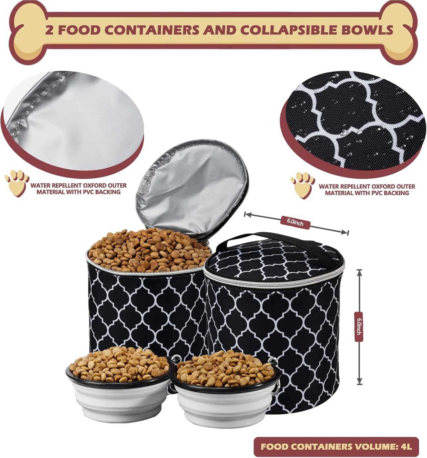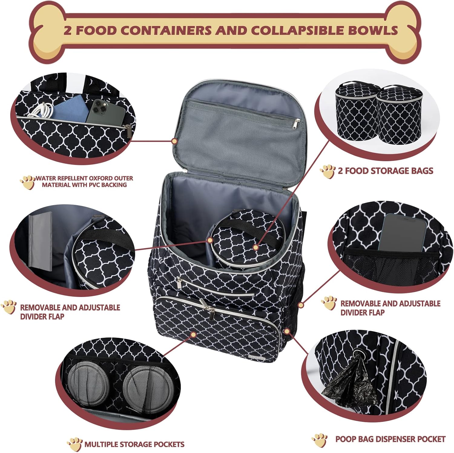 SUFFICIENT REASONABLE SPACE FOR USE- Dog bags for traveling with many compartments pockets and separators for optimized organization.2 separate carrying bags for carrying food,which are insulated and very convenient to clean,ensuring a clean and hygienic food environment for pets. The main compartment allows you to pack and organize skillfully and use pet/dog/cat/puppy items.