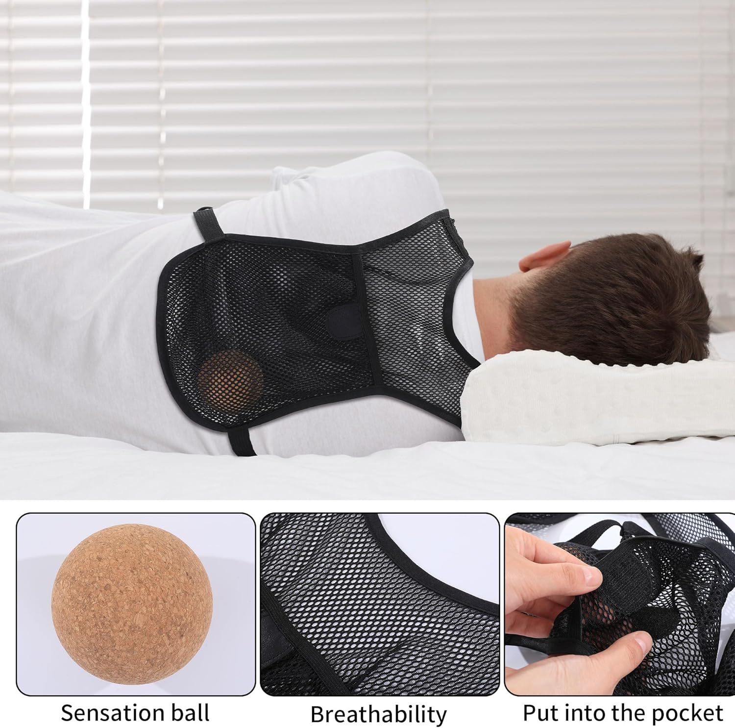 【Ingenious Design】Using the back compression ball encourages people to change their sleeping position and lie on their side so that the soft tissues inside the tongue and vocal cords don’t sag back and block the airway, helping to alleviate the snoring problem.