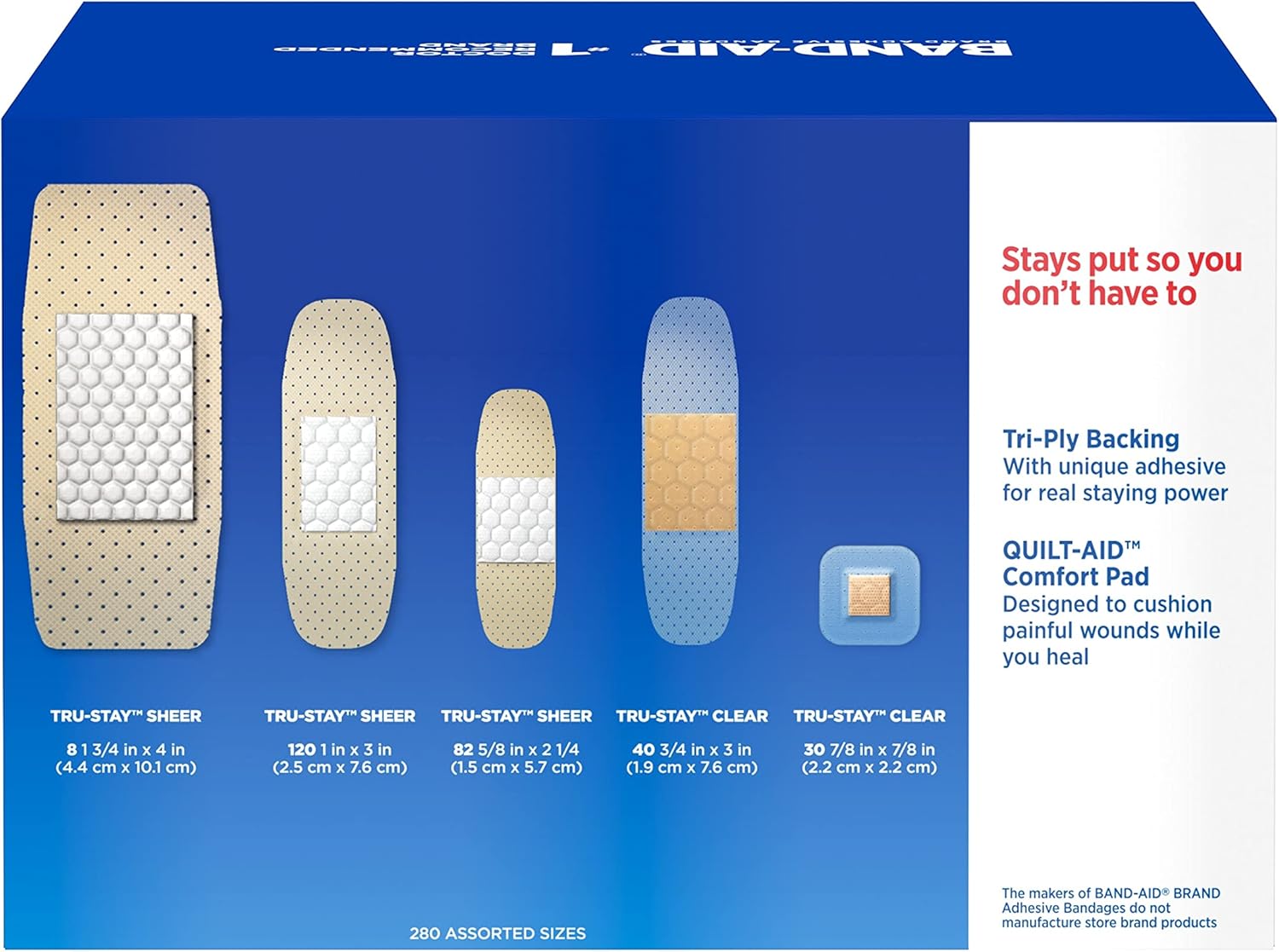 280 count box of Band-Aid Brand Sterile Adhesive Bandage Family Variety Pack includes sheer & clear flexible bandages in 5 different sizes and shapes. Covering minor cuts, scrapes & burns protect you against dirt & germs that may cause infections