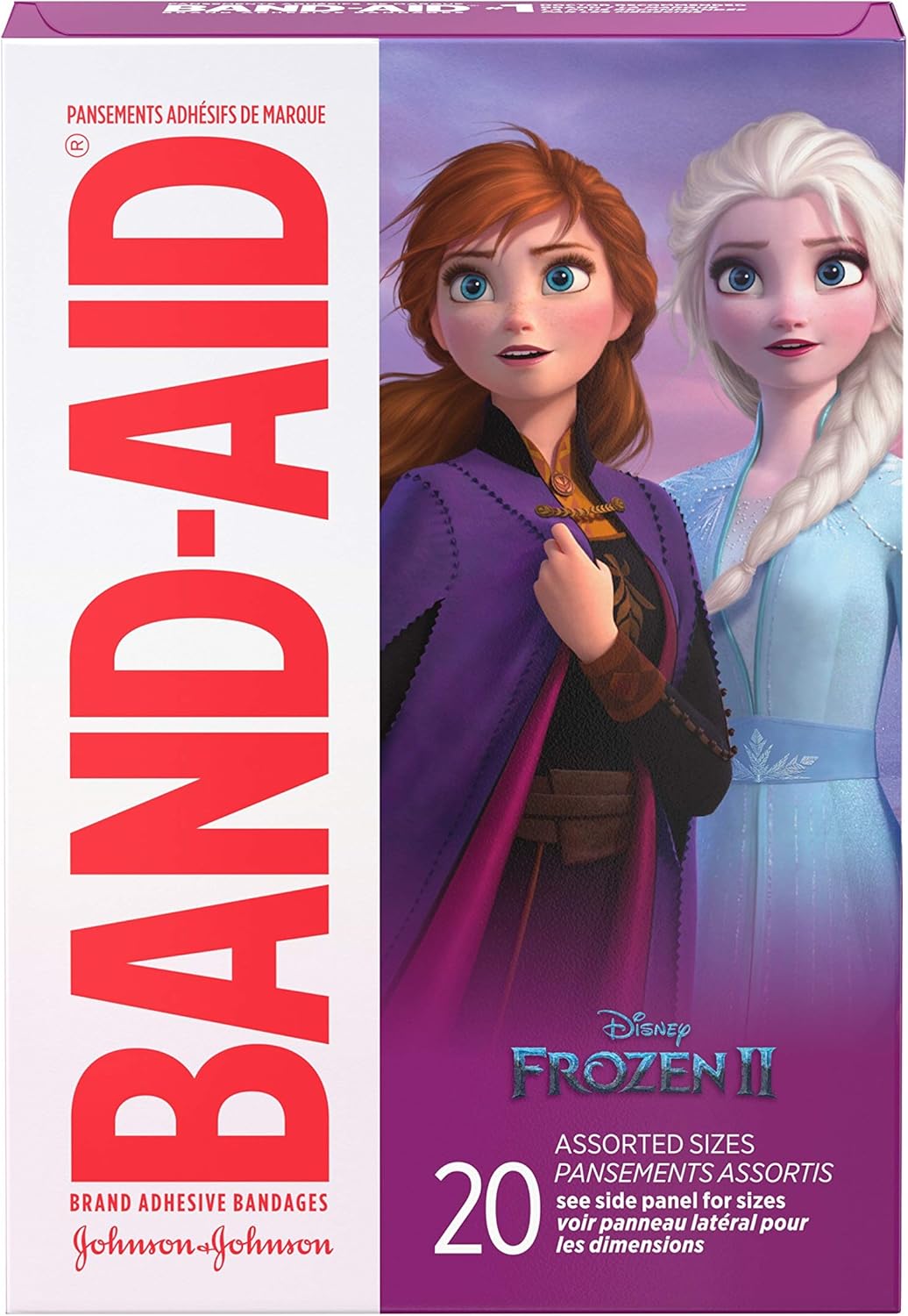 Band-Aid Brand Sterile Adhesive Individually Wrapped Character Bandages in assorted sizes for kids, featuring Disney Frozen designs, are designed to cover and protect minor cuts and scrapes with fun Disney Frozen graphics. These first aid sterile bandages come in assorted sizes with designs that include Elsa, Anna, Olaf, and others. Band-Aid Brand Adhesive Bandages feature a non-stick pad that allows the bandage to stick to the skin, not the wound. For first aid care, apply adhesive bandage to clean, dry skin and change daily, when wet, or as needed. This package contains 20 sterile decorative bandages for kids in assorted sizes suitable for small wounds. These individually wrapped bandages make the perfect addition to any home first aid kit or wound care supplies.