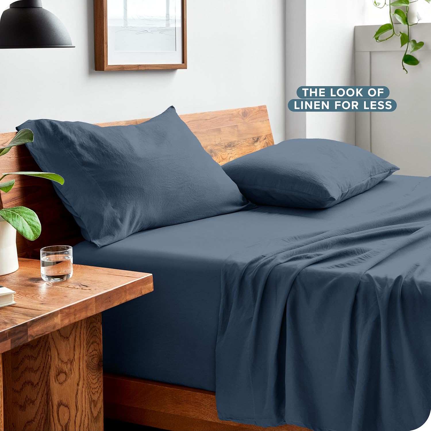 Bare Home Ultra Soft Washed Microfiber 4 Piece Sheet Set, Linen-Like Look, Easy Care, Hypoallergenic, Deep Pocket up to 15”, 1 Fitted Sheet, 1 Flat Sheet, 2 Std. Pillowcases (Queen, Bering Sea)