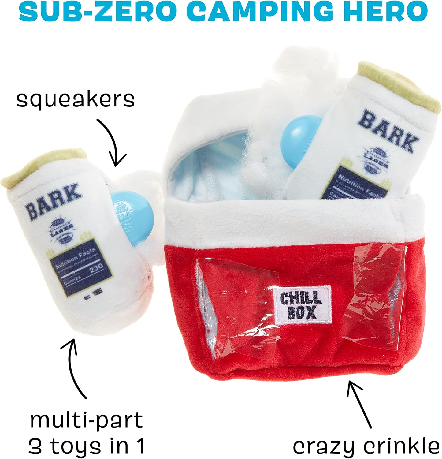 Meet Sub Zero Camping Hero: Bring the fun of camping indoors with our 2-in-1 drink cooler! This summertime plush toy comes with a crinkle cooler and two squeaky beer-can plushies that are filled with fluff. Rip open those cans and use the empty the cooler to hide treats for extra stimulation