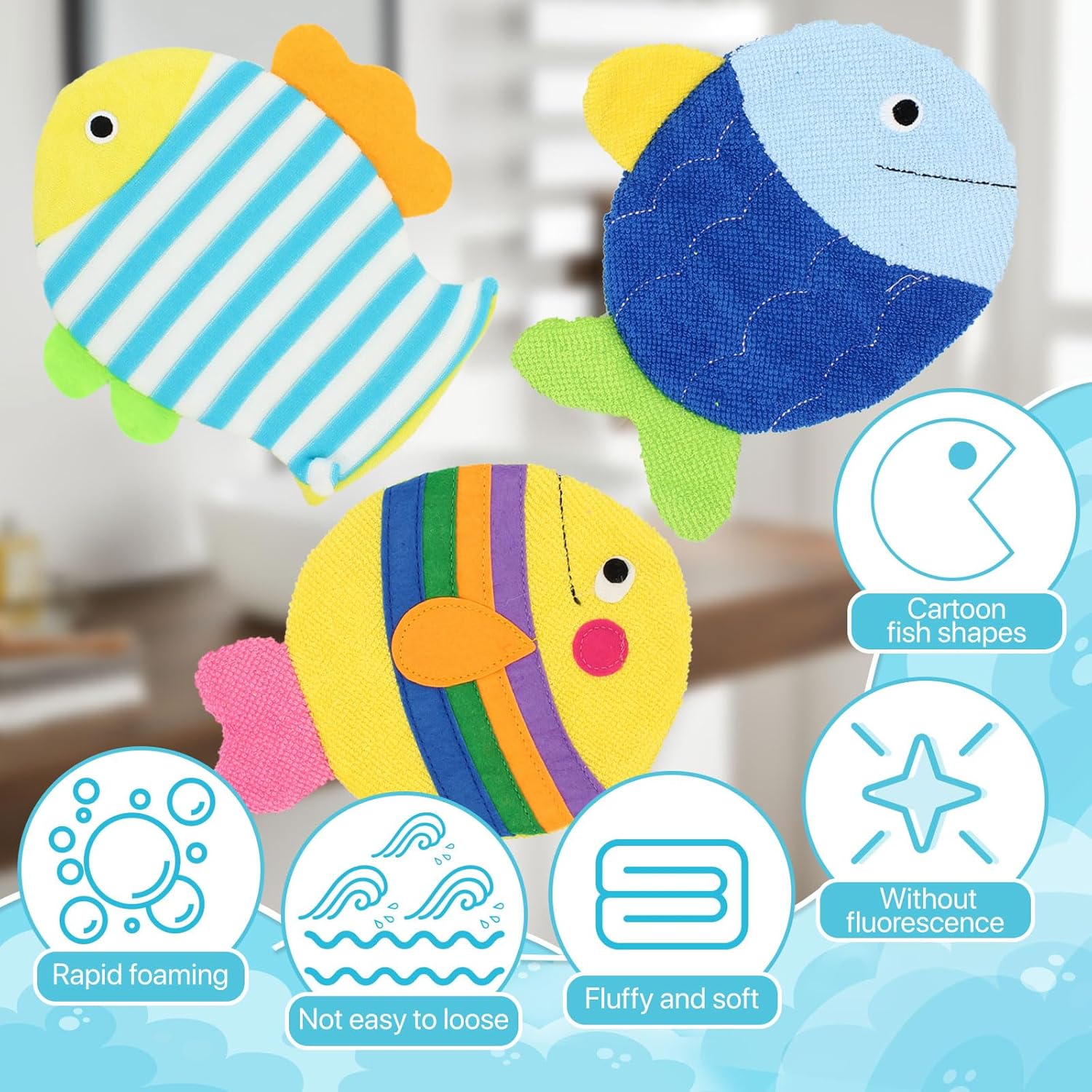 Bath Sponge Glove for Kids Shower Kit, 3pack Cartoon Fish Shape, Stay Clean Bath Towel, Bathroom Kitchen Cleaning Sponges Set for Dishwashing,Bathroom Cleaning, Kitchen Cleaning Supplies