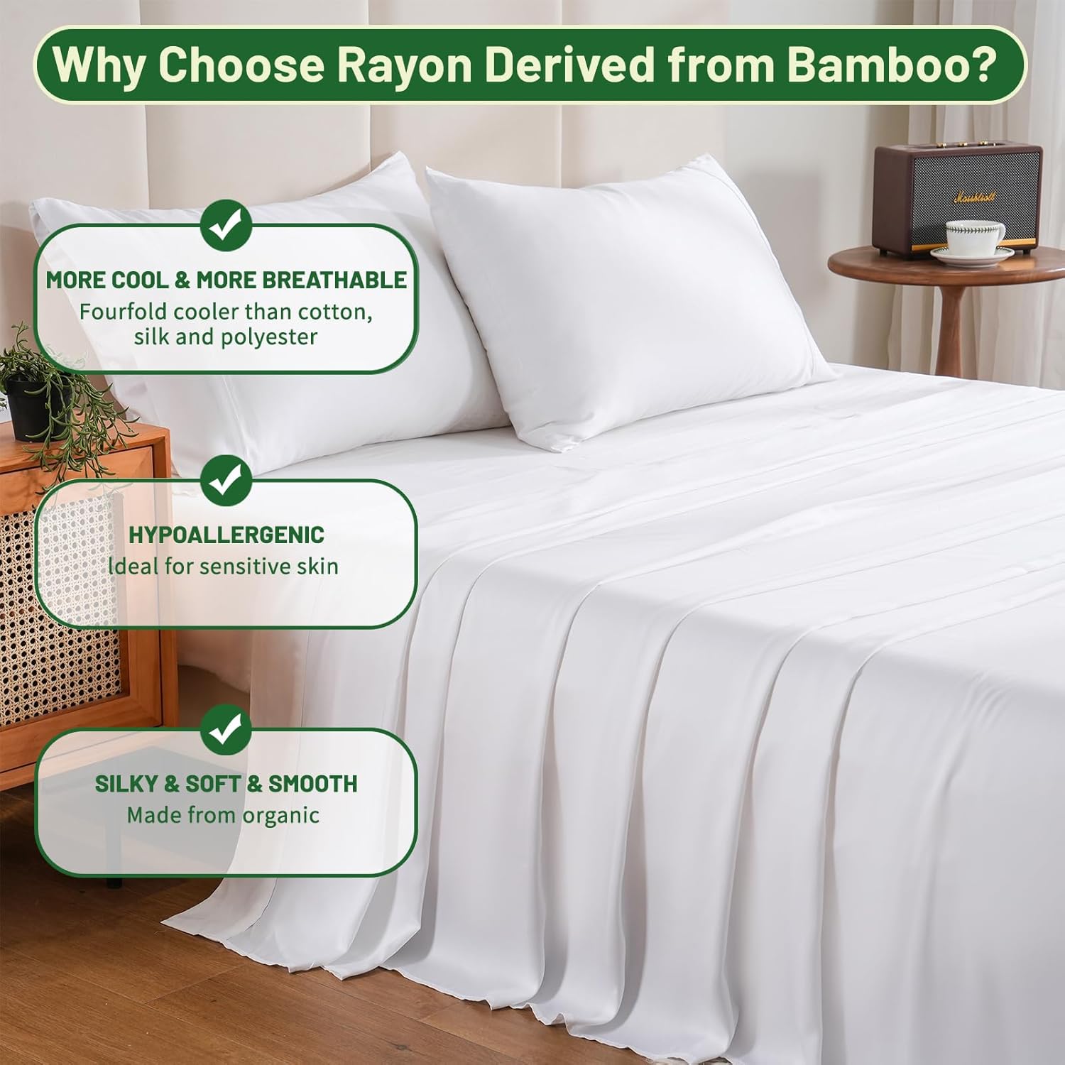 Organic Sheets:Our sheet set is made from 100% organic Rayon Derived from Bamboo, ensuring a soft and breathable sleep experience that’s safe for your skin and free of harmful chemicals, hypoallergenic and moisture-wicking, making it perfect for those with allergies or sensitive skin.