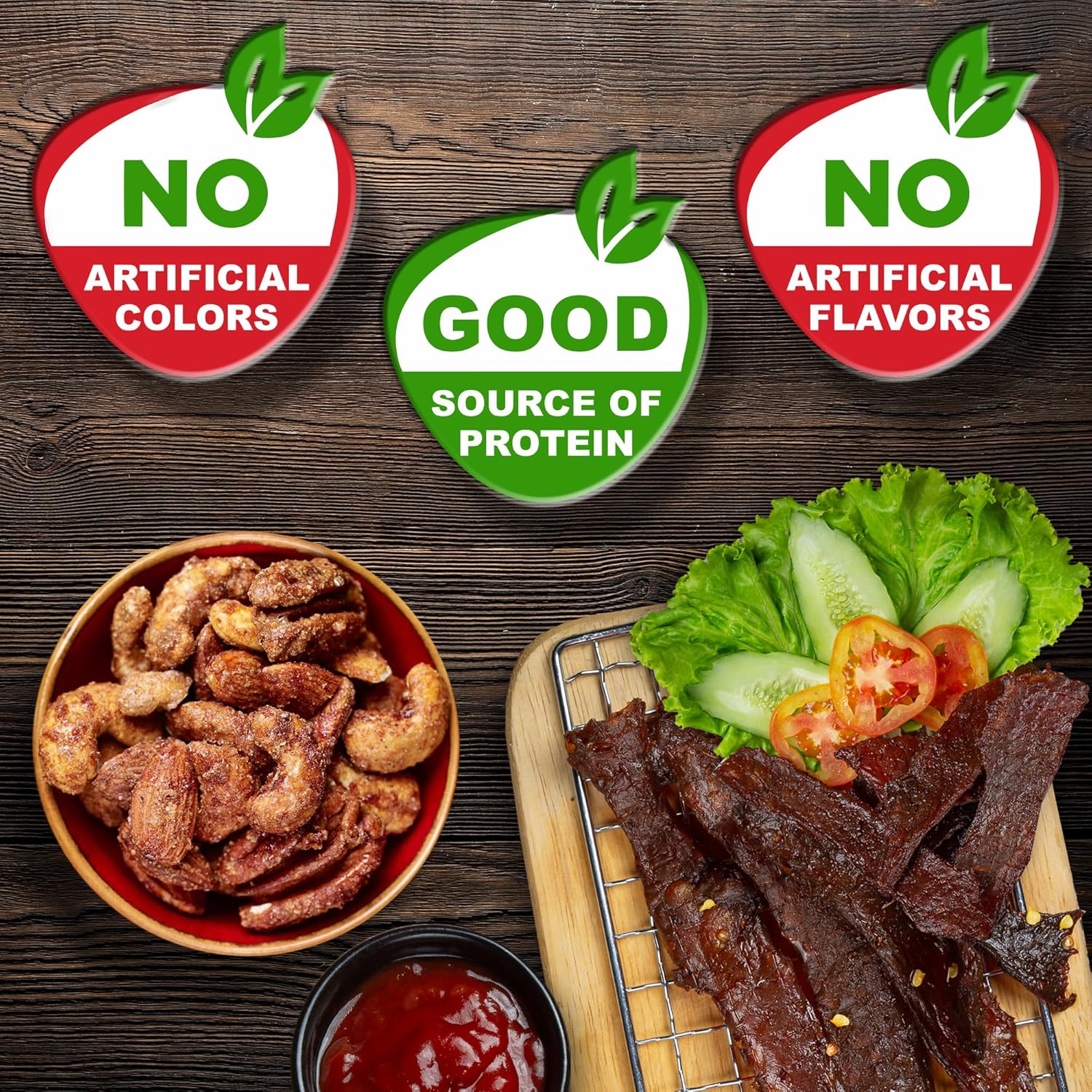 🔥EXOTIC JERKY VARIETY PACK: Experience a range of flavors, spice levels, and savories. Each item in this box is a great portable meal replacement and grab & go energy snack, perfect to leave in your office, home, or at a party! Great for a camping or outdoors trip!