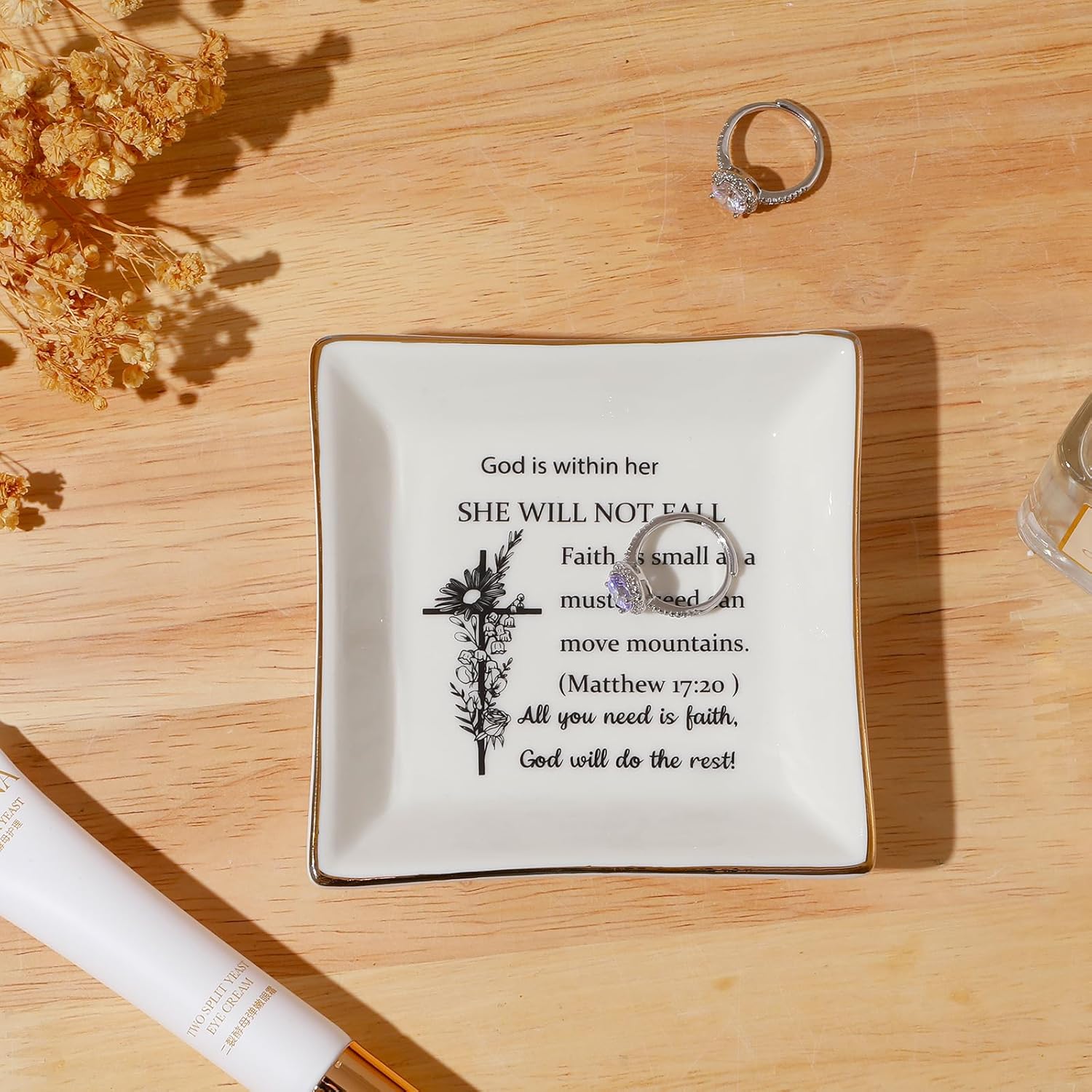 [Size & Material] The size is about 4.3″ L x 4.3″ W x 0.7H, 一 Our Christian ring dish is crafted from high-quality glazed ceramic, Well packed with a gift red box. The design is printed directly onto the plate, ensuring longer-lasting durability than other dishes using vinyl decals.