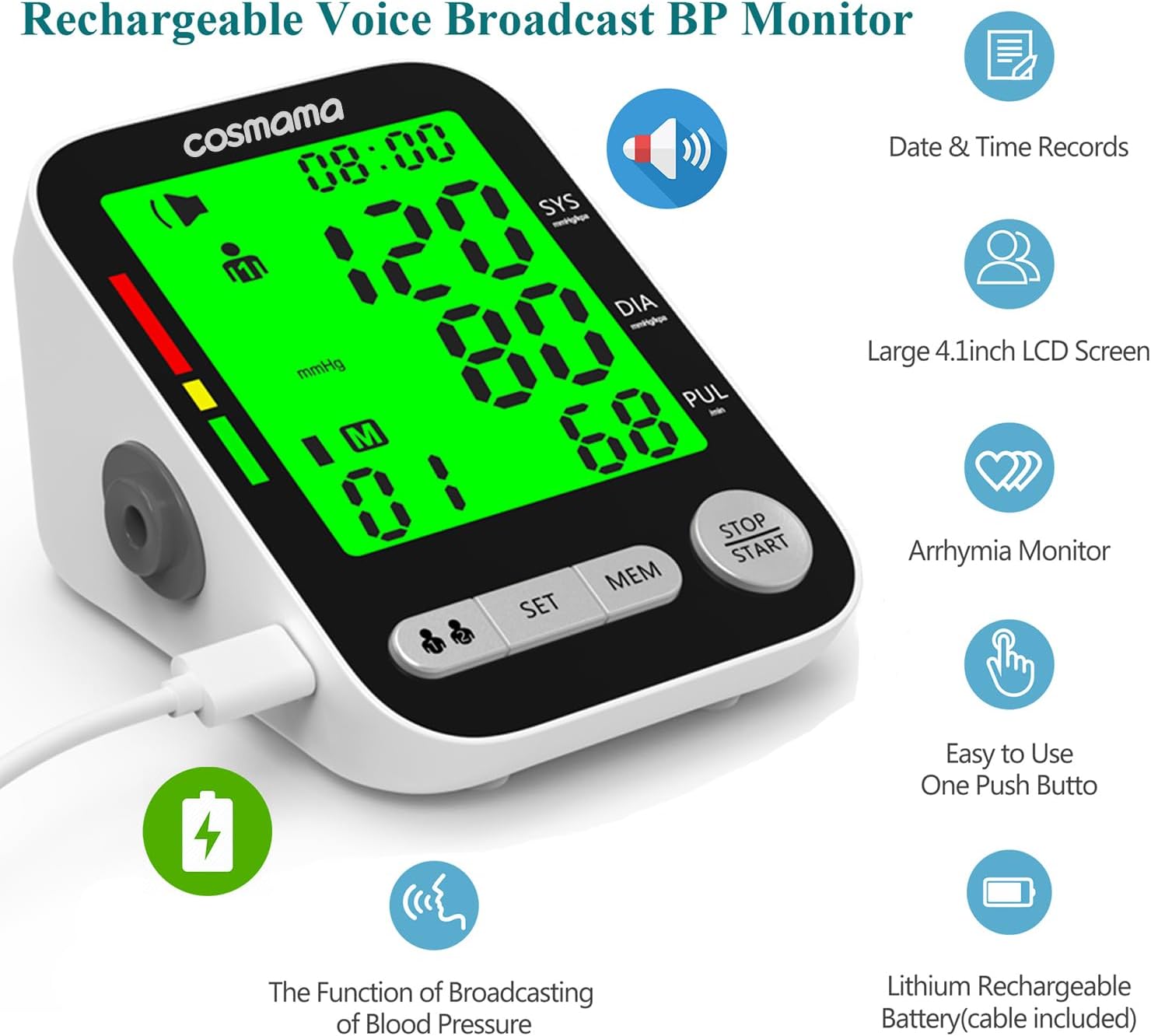 Blood pressure monitoring system has a nice voice I like the built-in USB charging so there’s no battery needed nice color display but does not give correct reading it is off by 10 points on the top and bottom number it over estimates your blood pressure compared with another blood pressure machine and compared with my doctor’s office and it was way off not worth the time or money