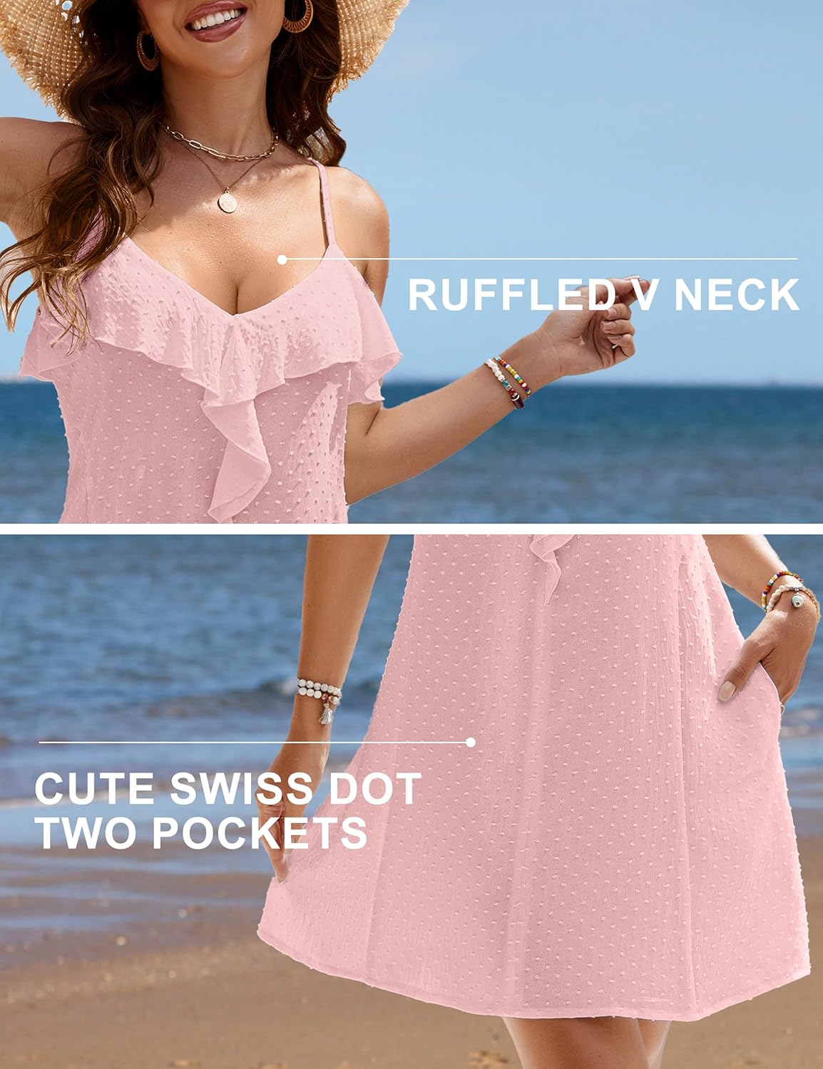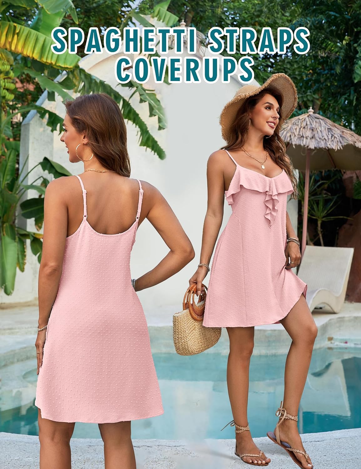 Blooming Jelly Women Spaghetti Strap Dress Beach Swimsuit Coverup Bathing Suit Cover Ups Swiss Dot Sundress with Pocket