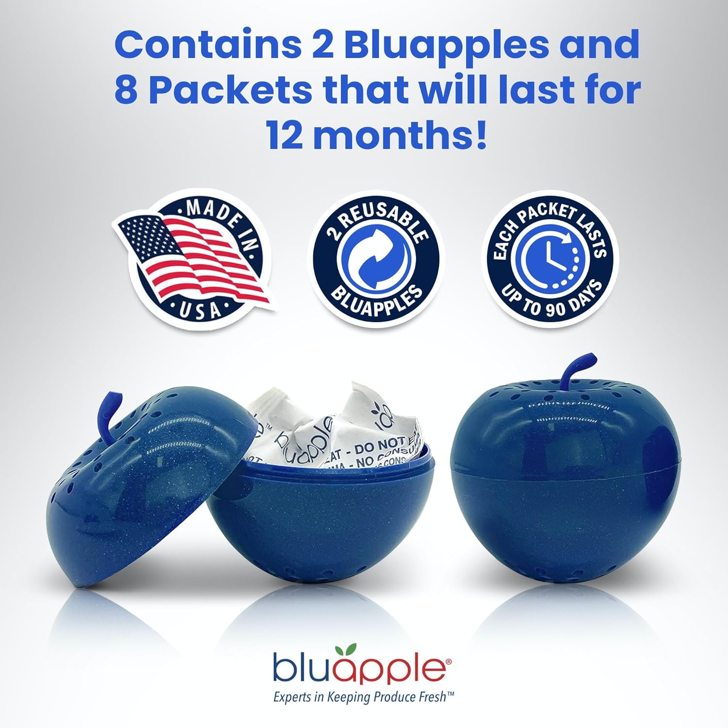 Bluapple Produce Saver Ethylene Gas Absorber One-Year Combo Pack w/Activated Carbon, Vegetable & Fresh Fruit, Food Freshness Extender, Fresh Fruit Preserver, Vegetable Saver, USA-Made, BPA-Free