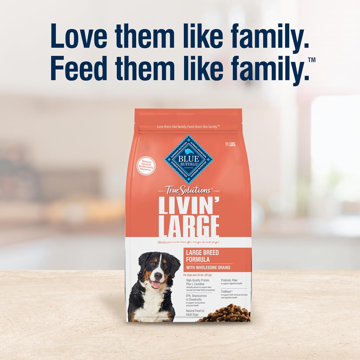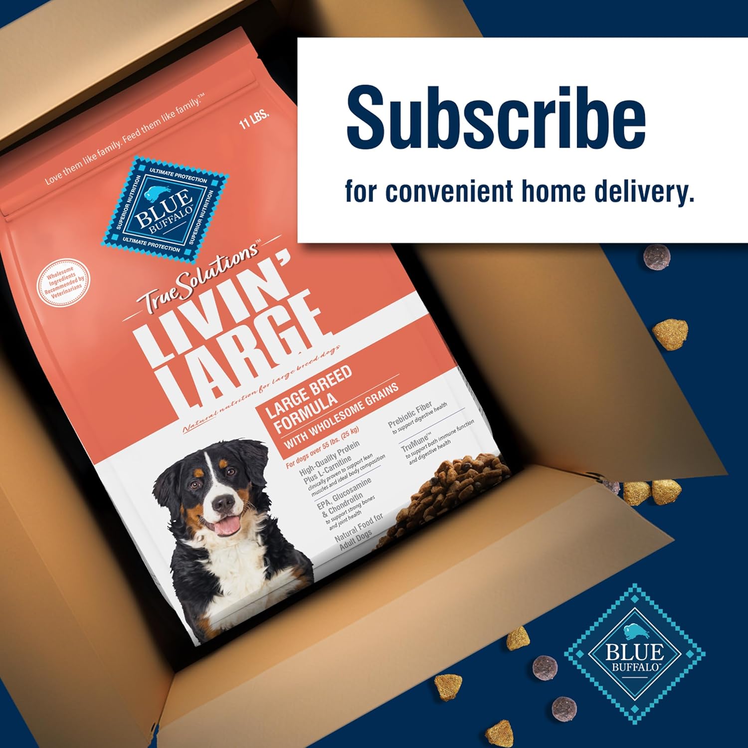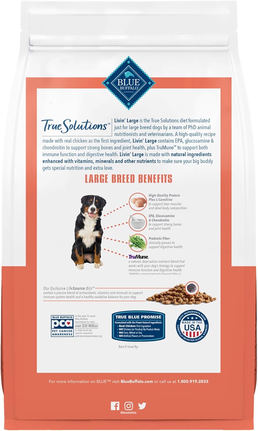 Contains: One (1) 11-lb. bag of BLUE True Solutions Livin’ Large Adult Dog Dry Food; Chicken