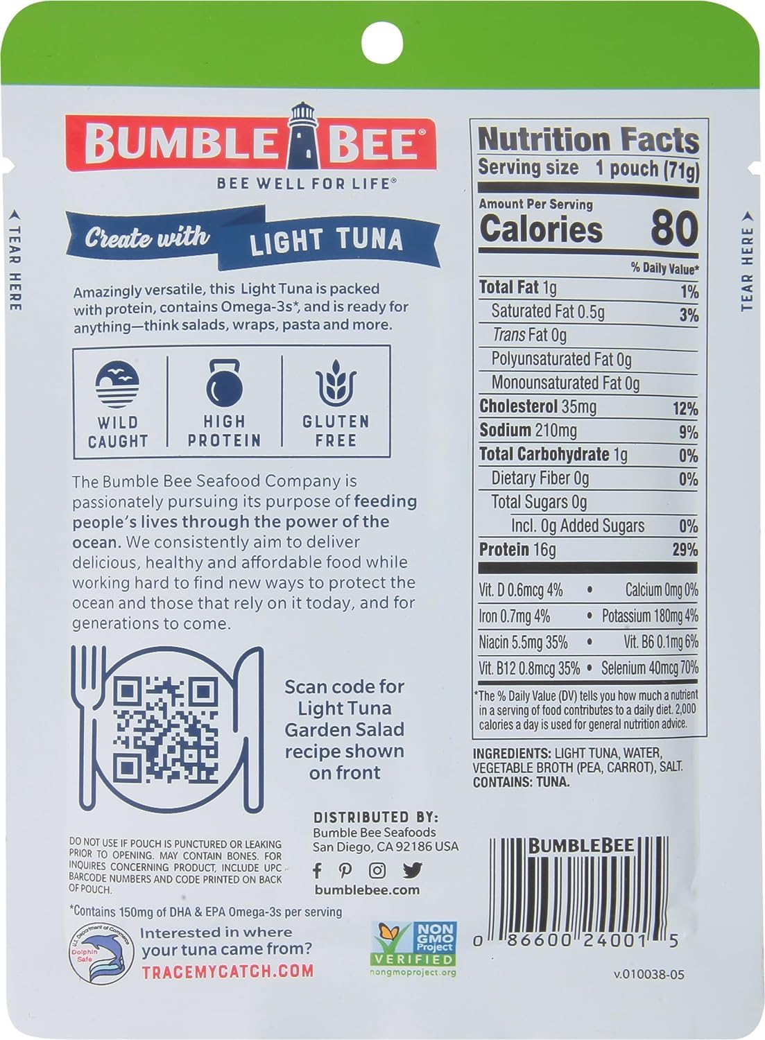 BUMBLE BEE Premium Light Tuna in Water–delicious light tuna in a super-convenient vacuum-sealed, ready to eat single-serve pouch. No can opener, no draining: Simply tear open to add your favorite tuna to sandwiches, salads and seafood recipes.