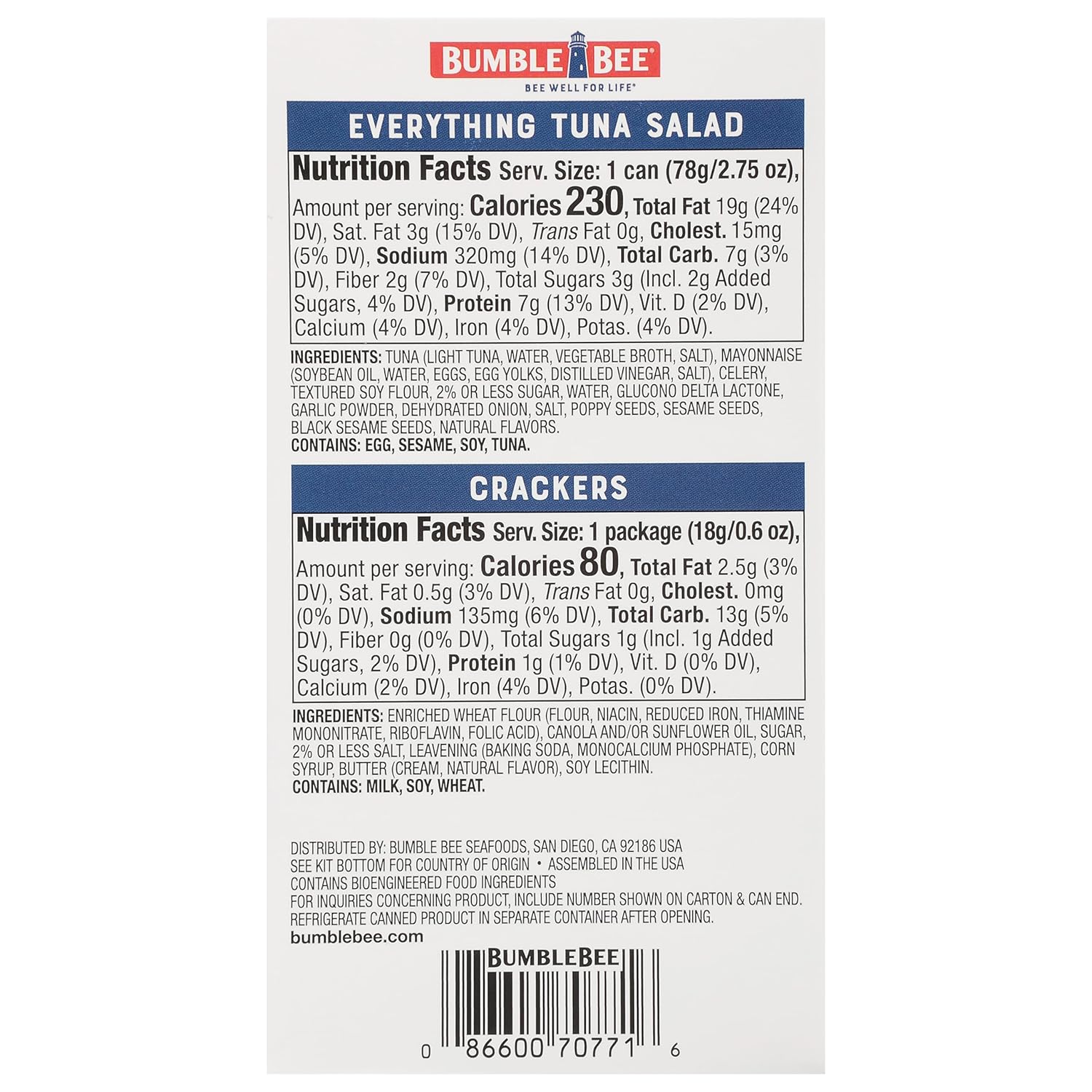SHELF STABLE TUNA SALAD KIT: Bumble Bee Everything Bagel Seasoning Tuna Salad Snack on the Run tuna salad with crackers kits require no refrigeration and is already mixed and ready-to-go wherever life takes you! Perfect for outdoor activities like hiking, biking, camping and sports.