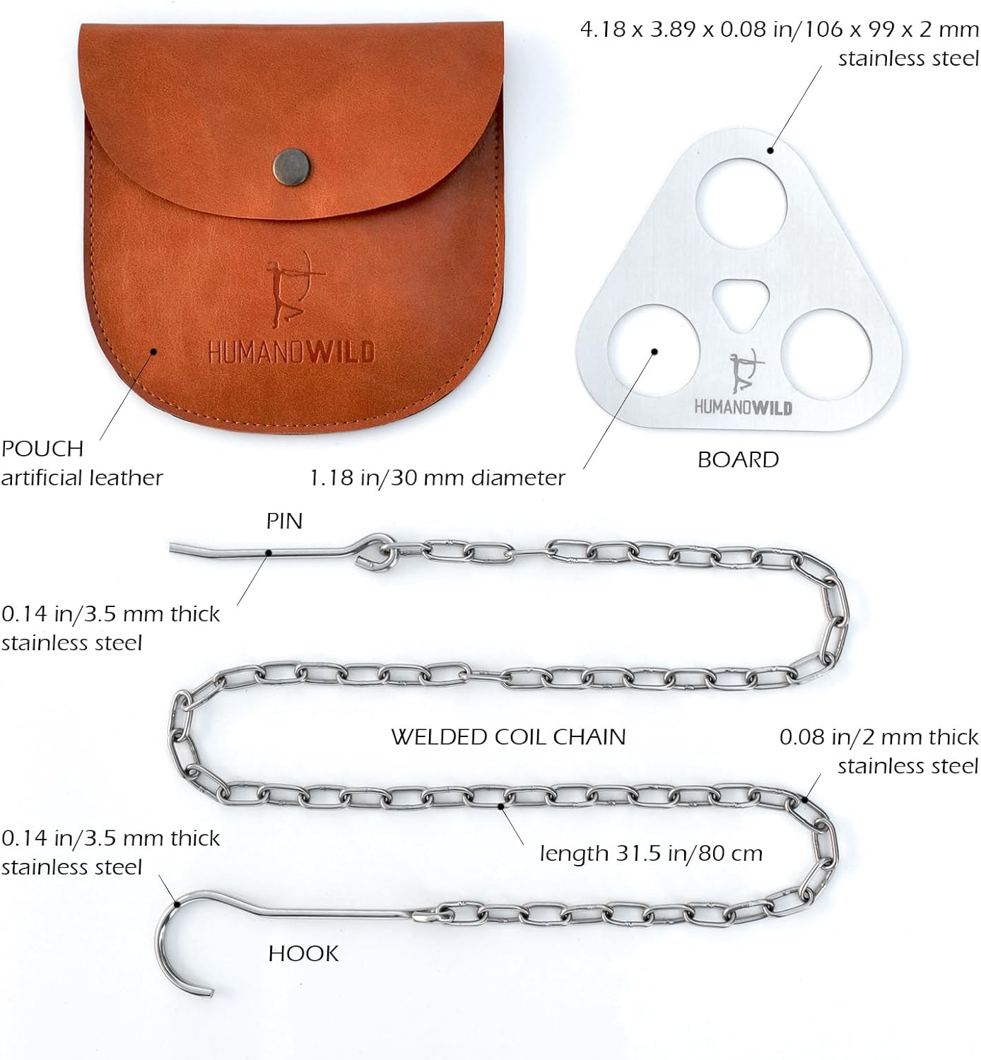 The large holes in the board are 1.18 inches in diameter, good to accommodate thick and sturdy branches. The chain can be adjusted to a suitable height at any time, matching the size of the pot or the fire. The length of 31.5 inches fits almost every possible situation in the field. The proof (test) load is 88 pounds. The construction is simple and sturdy. It will always perform as it should.